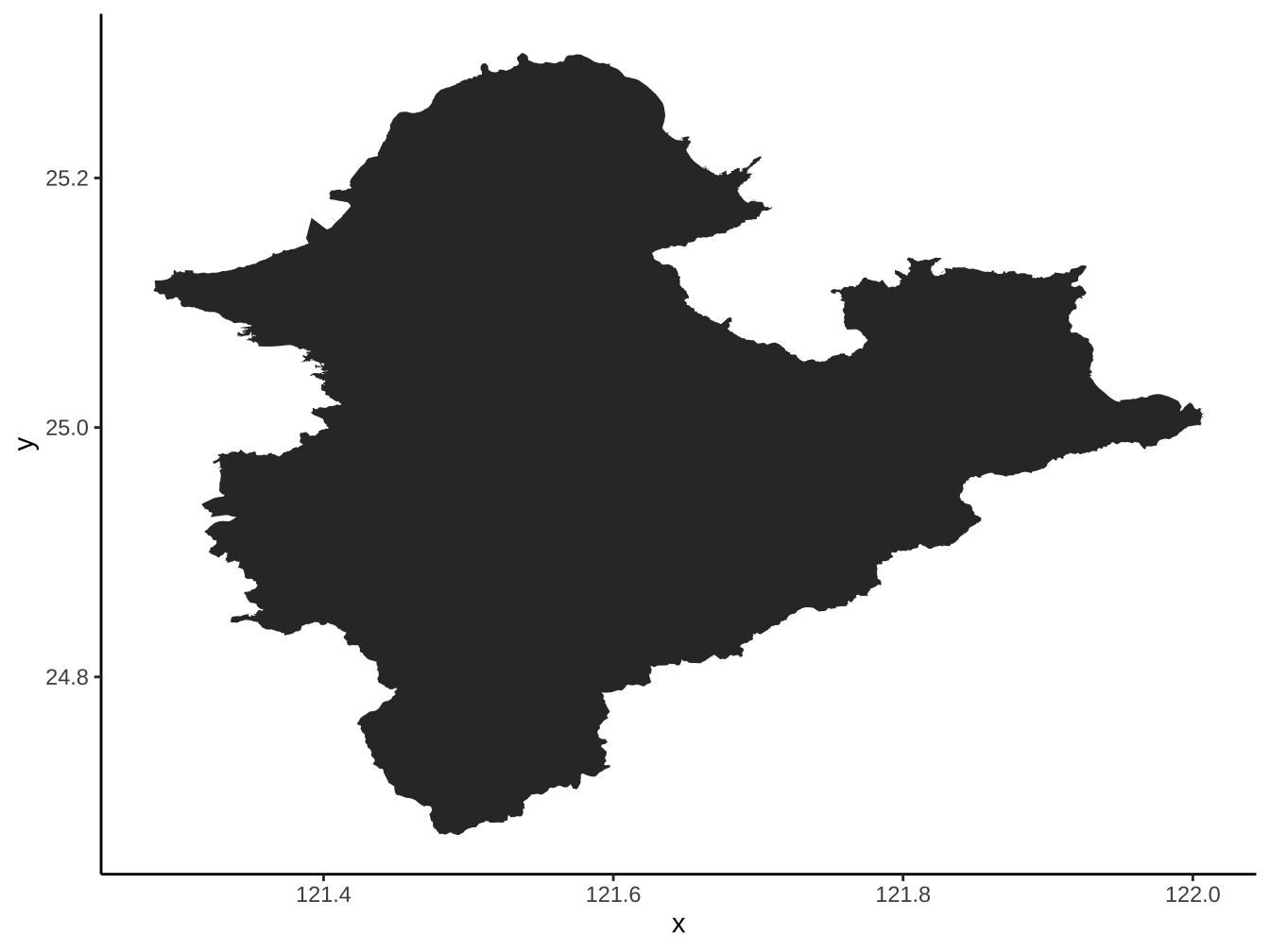 df_geo_northTW <- read_csv("https://www.dropbox.com/s/6uljw24zkyj7avs/df_geo_northTW.csv?dl=1")選出COUNTYNAME為“新北市”以geom_polygon繪出如下形狀: