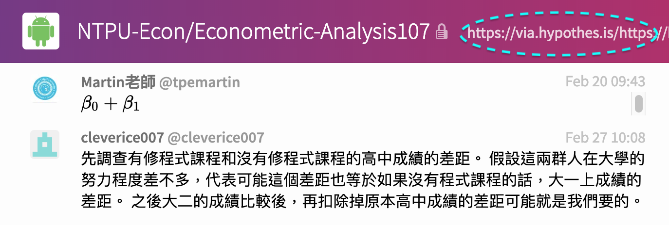 點開gitter討論室:https://gitter.im/NTPU-Econ/Econometric-Analysis107
