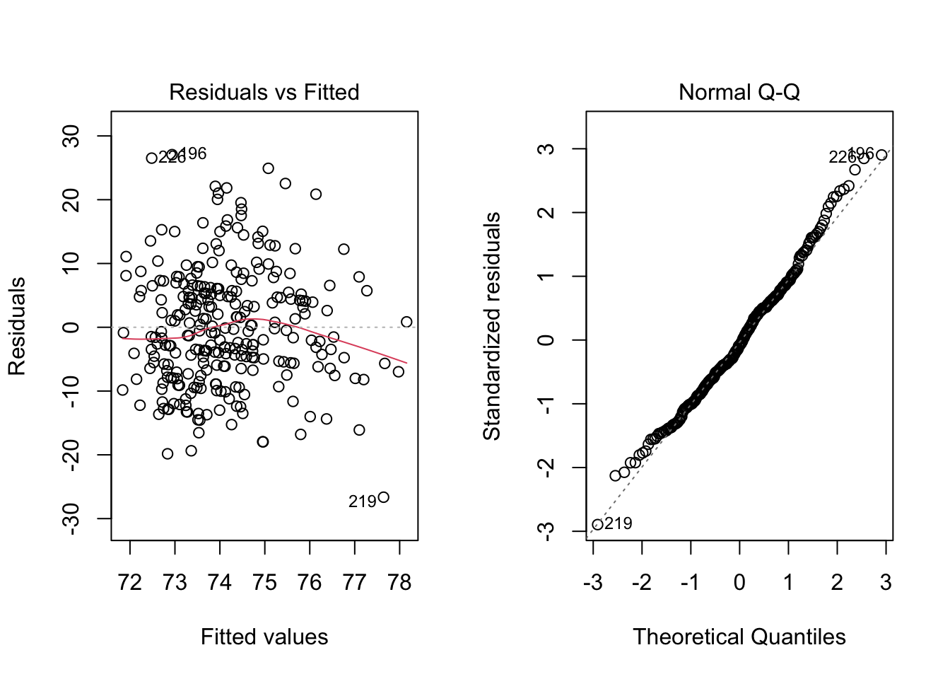 par(mfrow=c(1,2))hers_subset <-read.csv("https://www.dropbox.com/s/t0ml83xesaaazd0/hers_subset.csv?dl=1")lm.hers <-lm(DBP ~ BMI, data = hers_subset)plot(lm.hers,1) # The residual versus fitted plotplot(lm.hers,2) # The normal quantile plot