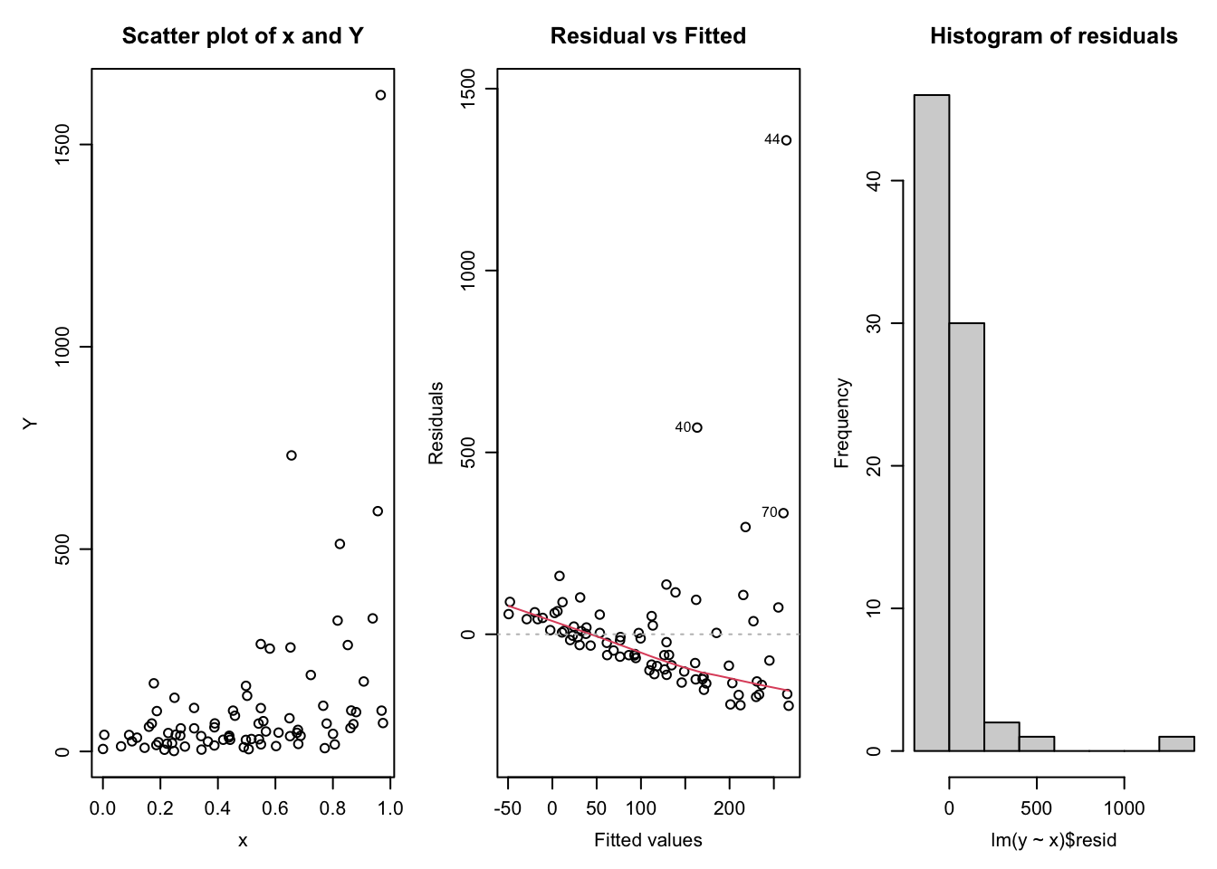 We can immediately see a number of problems that would deter us from fitting a linear regression of \(Y\) on \(x\). First, there is no clear linear relationship between \(Y\) and \(x\). Secondly, the variability of the \(Y\)-values increases with \(x\). Thirdly, the residuals of a linear regression are clearly non-normal, and heavily right-skewed. Indeed a histogram of \(Y\) shows that the outcome is heavily right skewed.