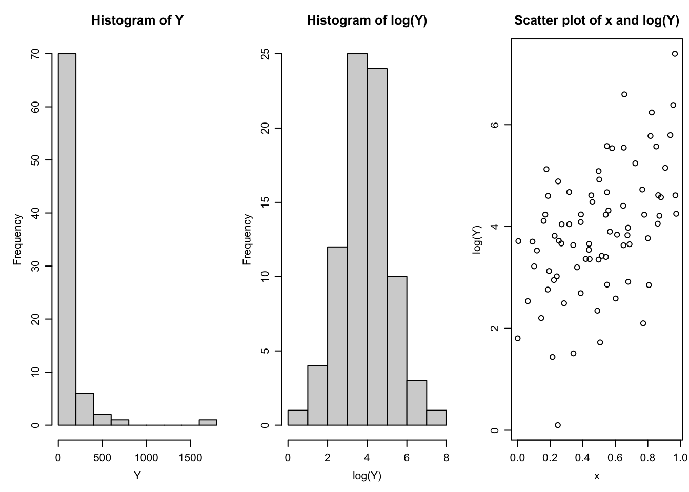 This example is a rather extreme case with respect to the distribution of the covariate and it is probably fair to say that transformations of \(x\) are not usually as important to consider as transformations of the outcome. Since the linear model takes the values of \(x\) as given, so there is no modelling of their distribution, there is no formal need to obtain a “nice” symmetric distribution of the independent variable. However, when we discuss the concept of leverage in week 3 we will see that highly skewed \(x\) distributions are undesirable because they may lead to just one or two observations having an unduly large influence on the estimated regression model.