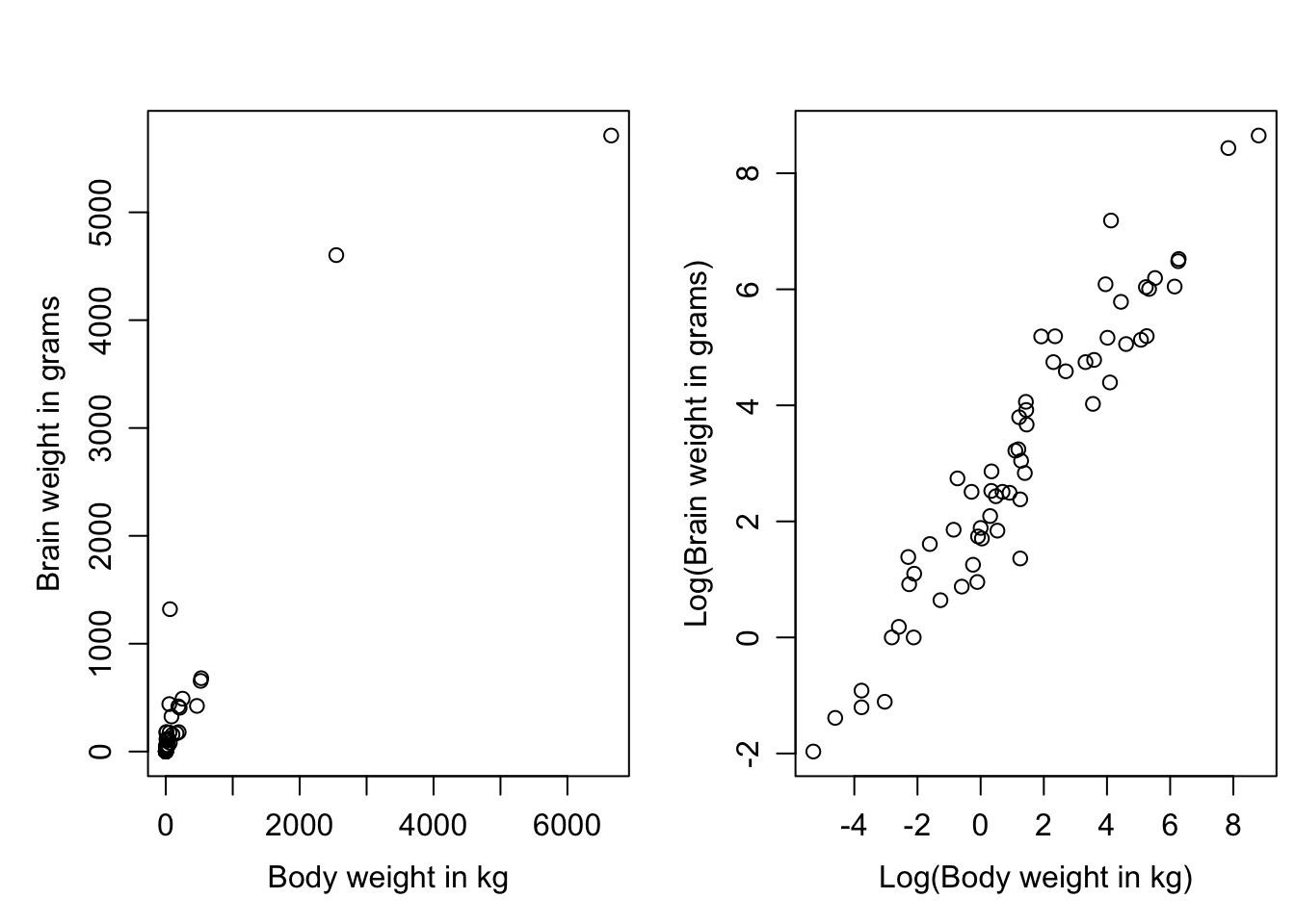 As almost all the data are bunched up in the bottom left hand corner. However, a logarithmic transformation of both brain and body weight reins in the extreme values on both axes and produce a scatterplot worth pursuing with linear regression.