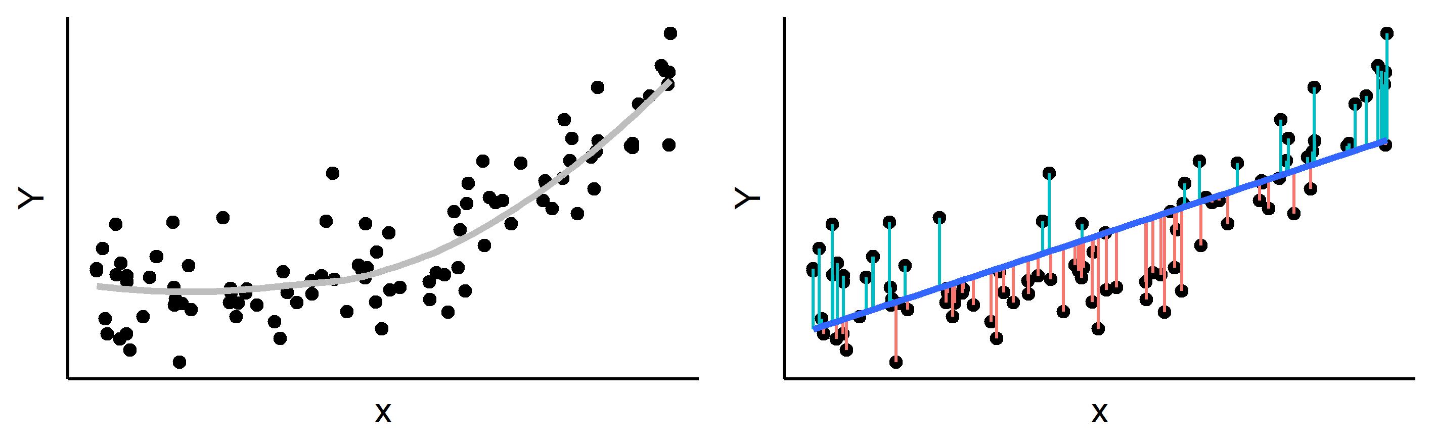 This assumption requires a linear (straight) relationship between the outcome and predictor. The plot below shows the effect of a non-linear relationship on the residuals.