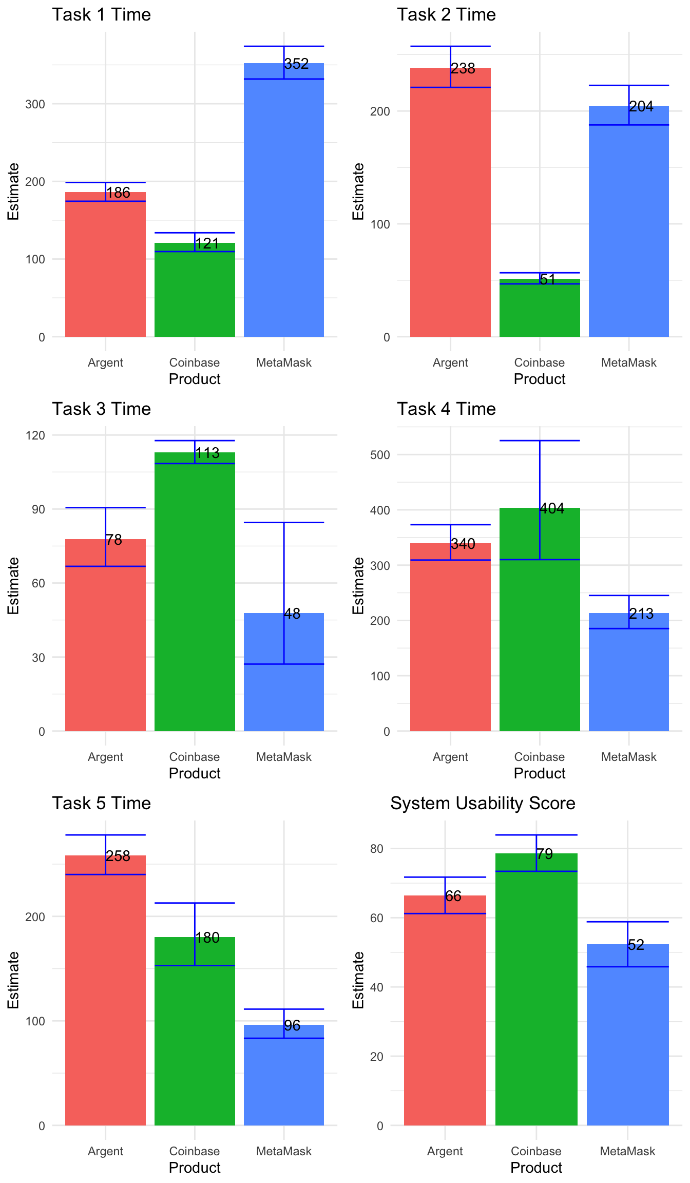And all p-values, for the pairwise tests, are below .15, which indicates that all “task times” are significantly different from one wallet to the next, at the 85% confidence level. The final point estimates are printed below for the continuous variables. Remember that we use geometric mean as the point estimate for “task times”. Also, the system usability scores (SUS’s) are significantly different between the wallets (Coinbase > Argent > MetaMask).