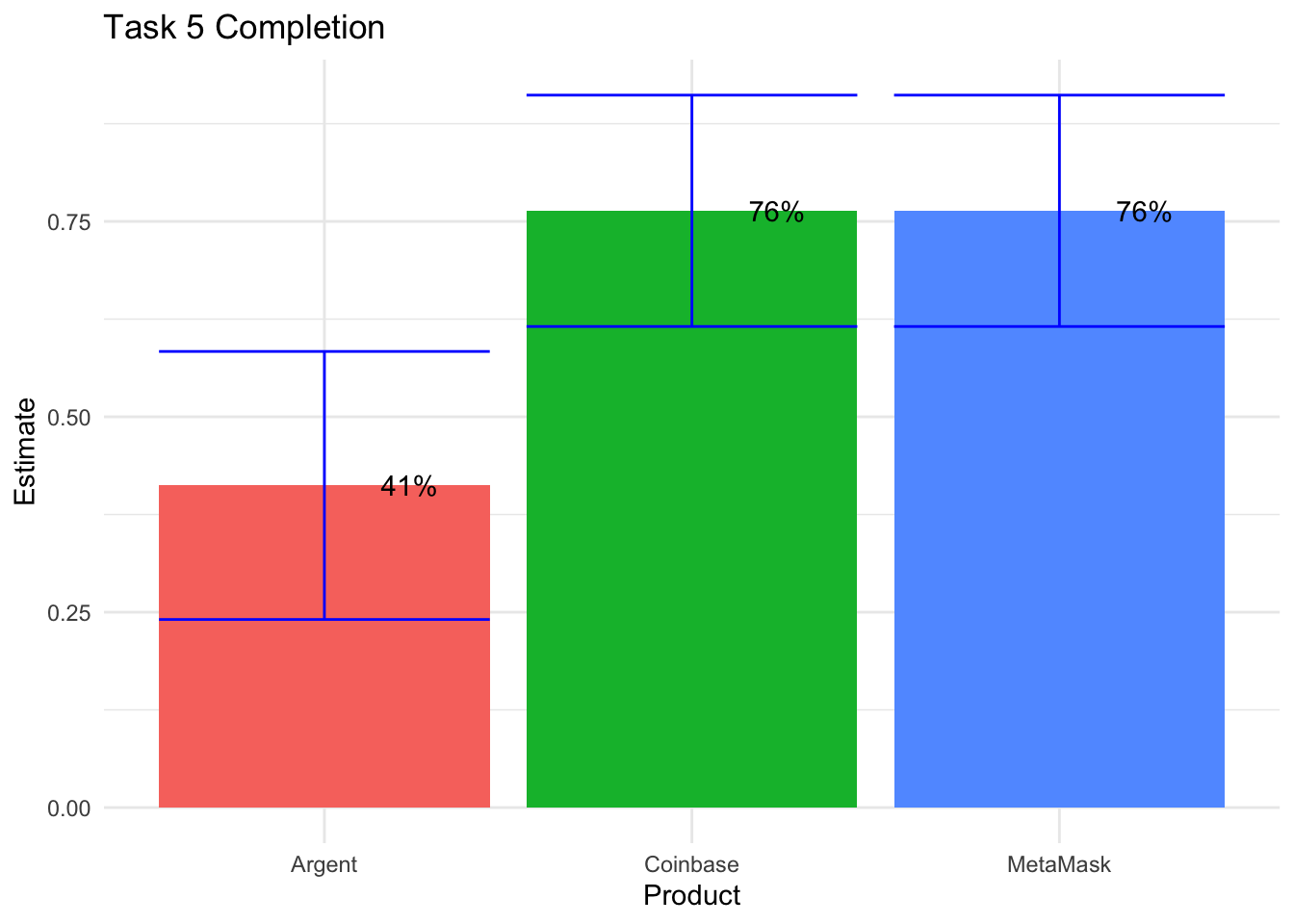 Red means poorest performance, green means best performance, and orange means that it’s middle-of-the-road performance. MetaMask has the greatest completion on Task 4, but the lowest completion on Tasks 1 and 3, and the lowest SUS. Argent has the lowest completion on Task 5, and a middle-of-the-road SUS. Finally, Coinbase has the lowest completion on Task 4, but relatively high completion on the other tasks, as well as the highest SUS. This performance comparison indicates to product managers of the respective apps which areas to focus their UX improvements.