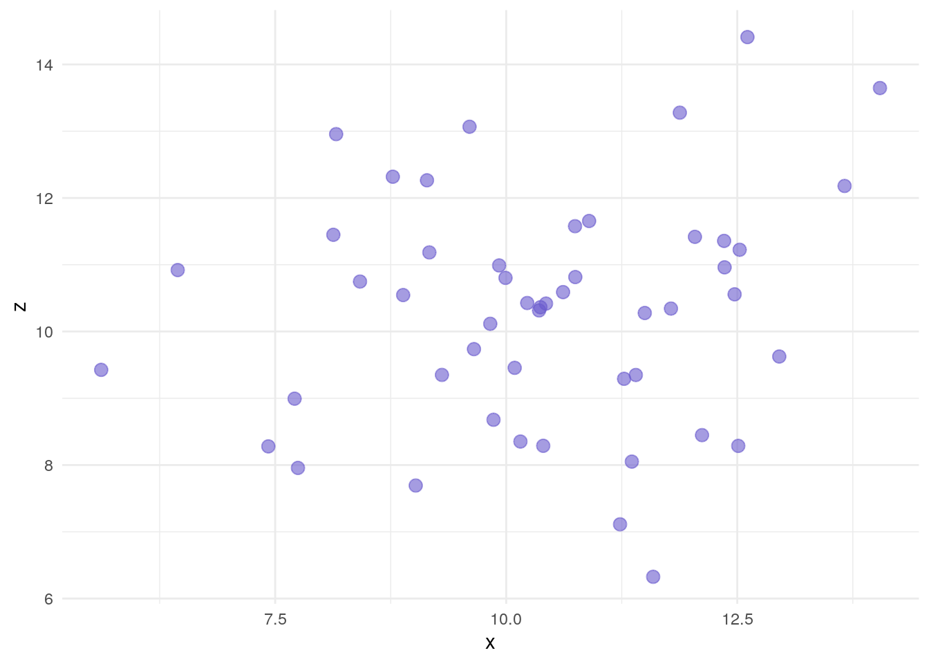 Using ggplot, create a scatterplot of x and y.Just make any old scatterplot.