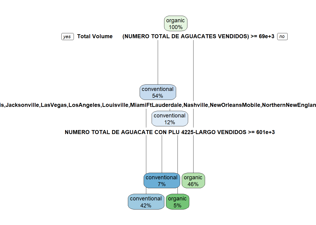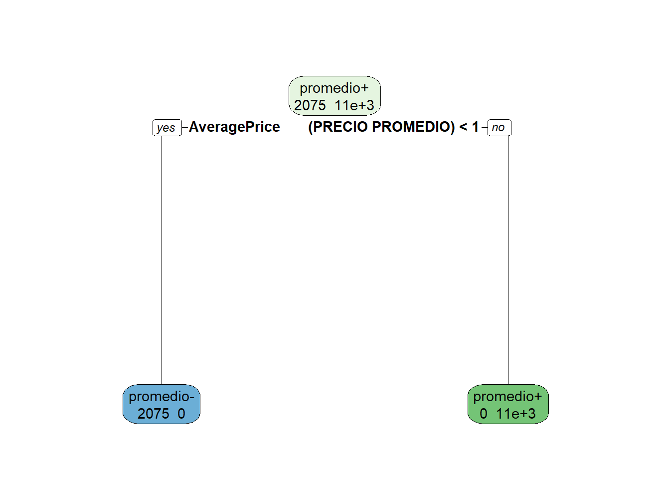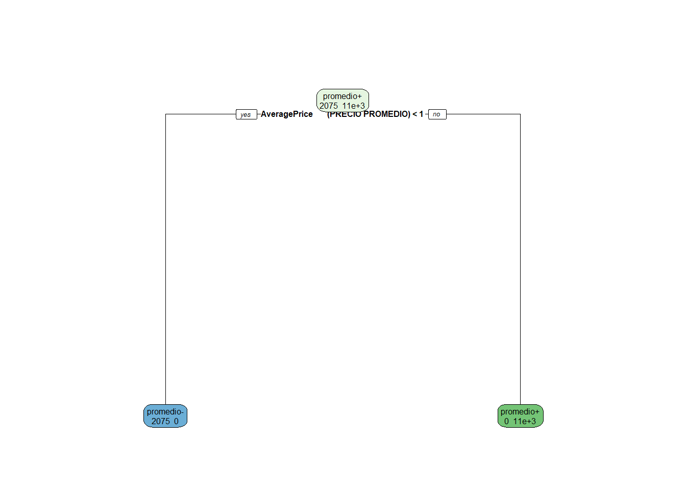 # Ejemplo 2: minbucket=20 (minsplit=60) para obtener un árbol con más ramas modelo_arM3 <-rpart(cat_Aguacate~. , data = trainM2, method ="class", minbucket=20)# Mostrar el árbolprint(modelo_arM3)
