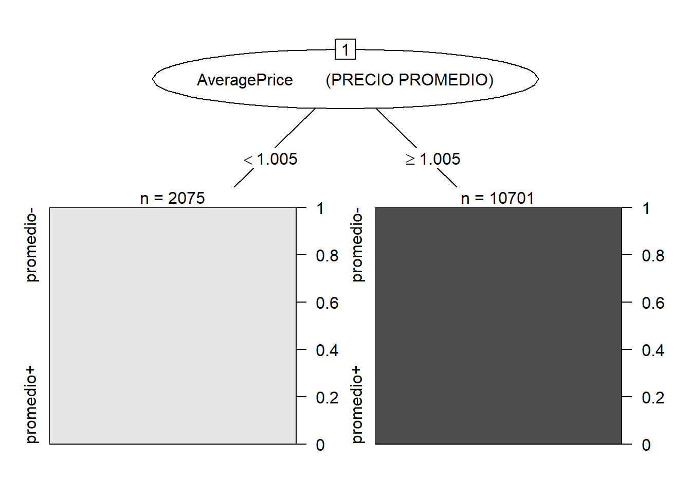 # Controlando el crecimiento del árbol# con el parámetro de complejidad (cp=0.02) modelo_arM4 <-rpart(cat_Aguacate~. , data = trainM2, method ="class", cp=0.02)# Mostrar el árbolprint(modelo_arM4)