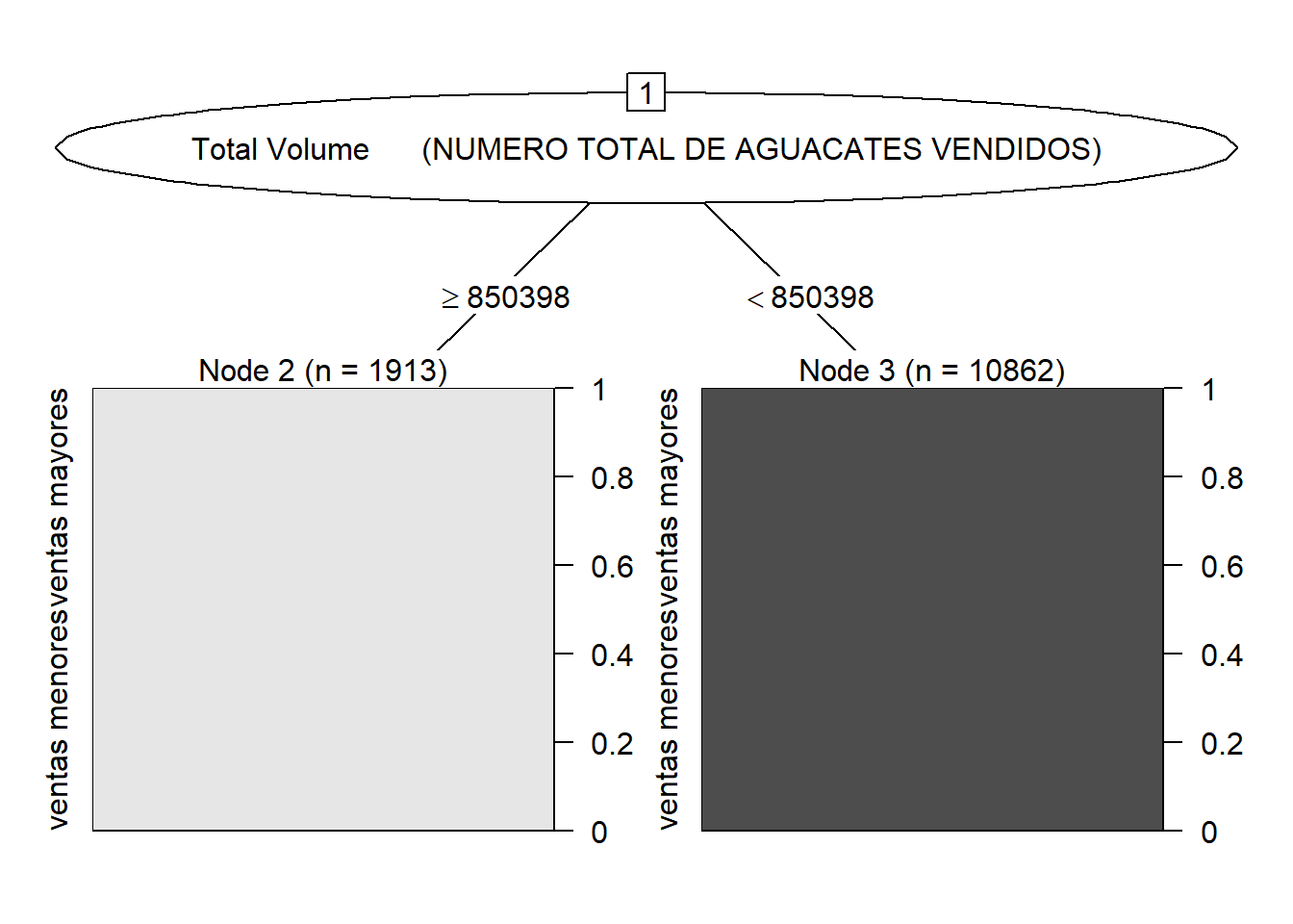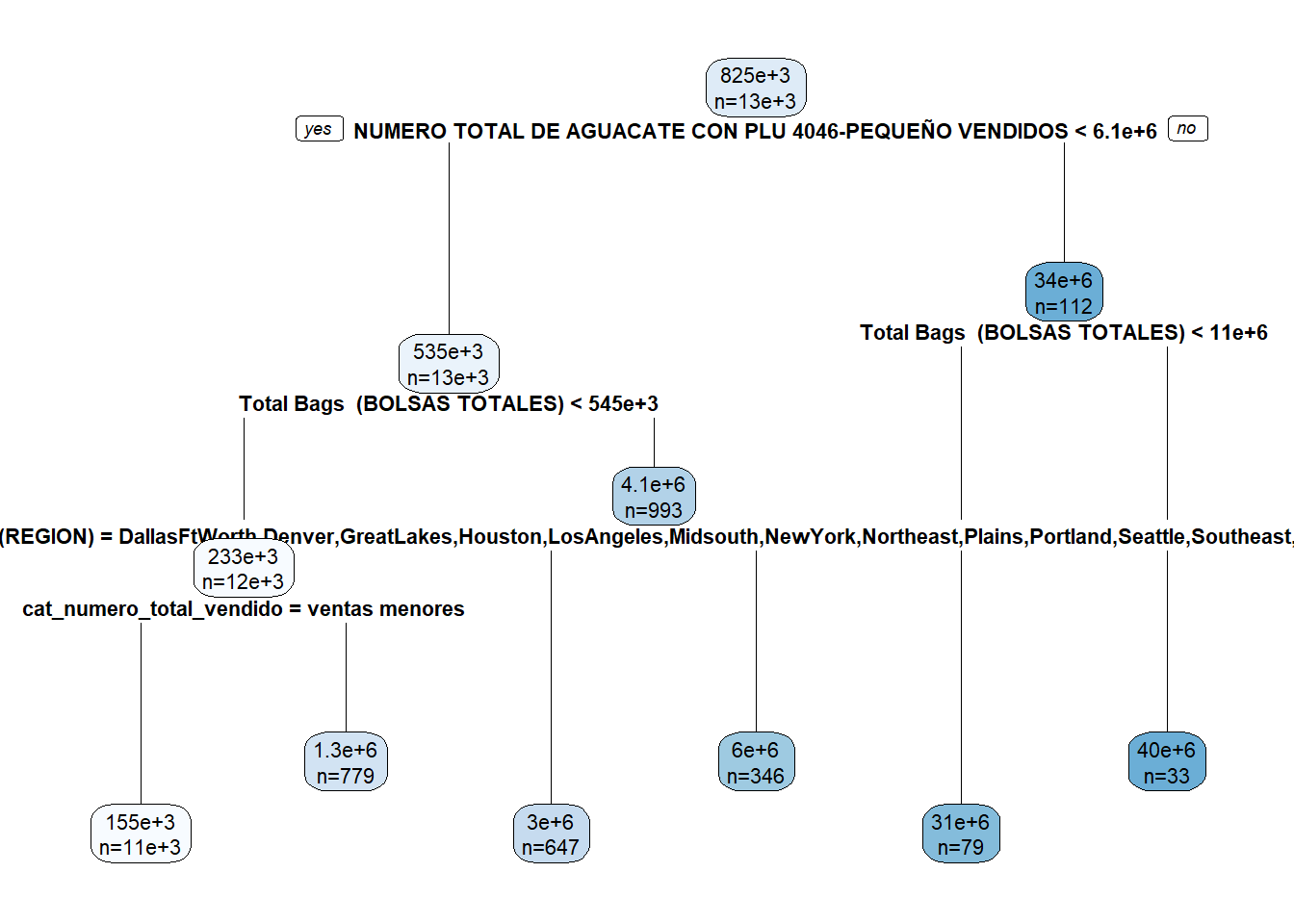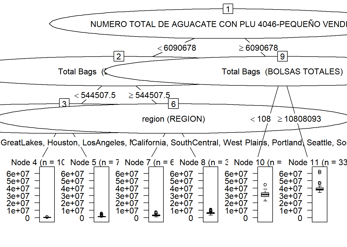 # Modelo modelo_regM8 =rpart(`Total Volume (NUMERO TOTAL DE AGUACATES VENDIDOS)`~ ., data=trainM3, method="anova", cp=0.005)# Imprimir modeloprint(modelo_regM8)