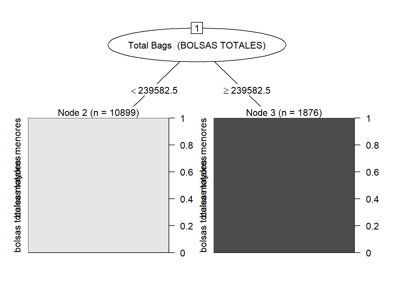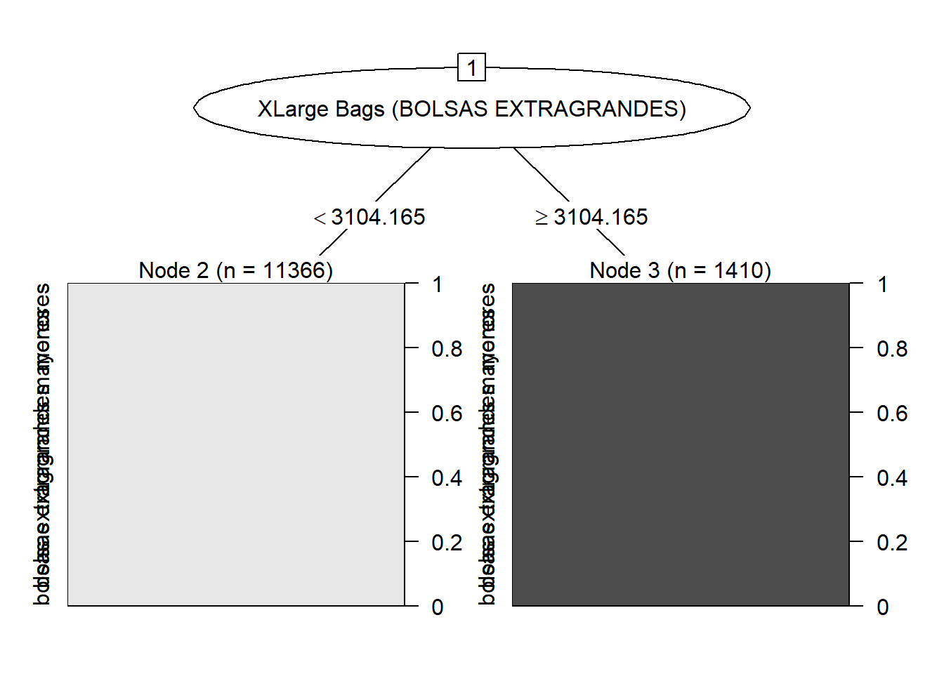 | | [11] Total Bags (BOLSAS TOTALES) >= 10808092.5: 39946579.606 (n = 33, err = 1.300788e+15)