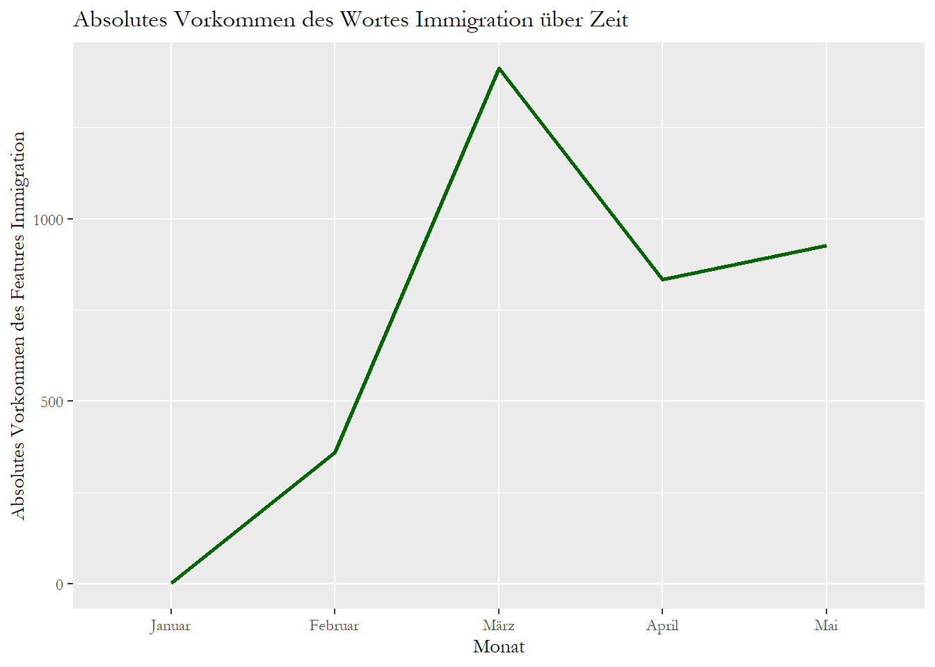 Wir weisen den jeweiligen Monat, in dem ein Artikel publiziert wurde, dabei sowohl als Character-Vektor als auch als numerischen Wert der DFM zu, damit wir die Entwicklung über Monate später von Monat 1 des Jahres (Januar) bis Monat 5 des Jahres (Mai) aufzeigen können, indem wir die Daten nach Monat chronologisch sortieren.