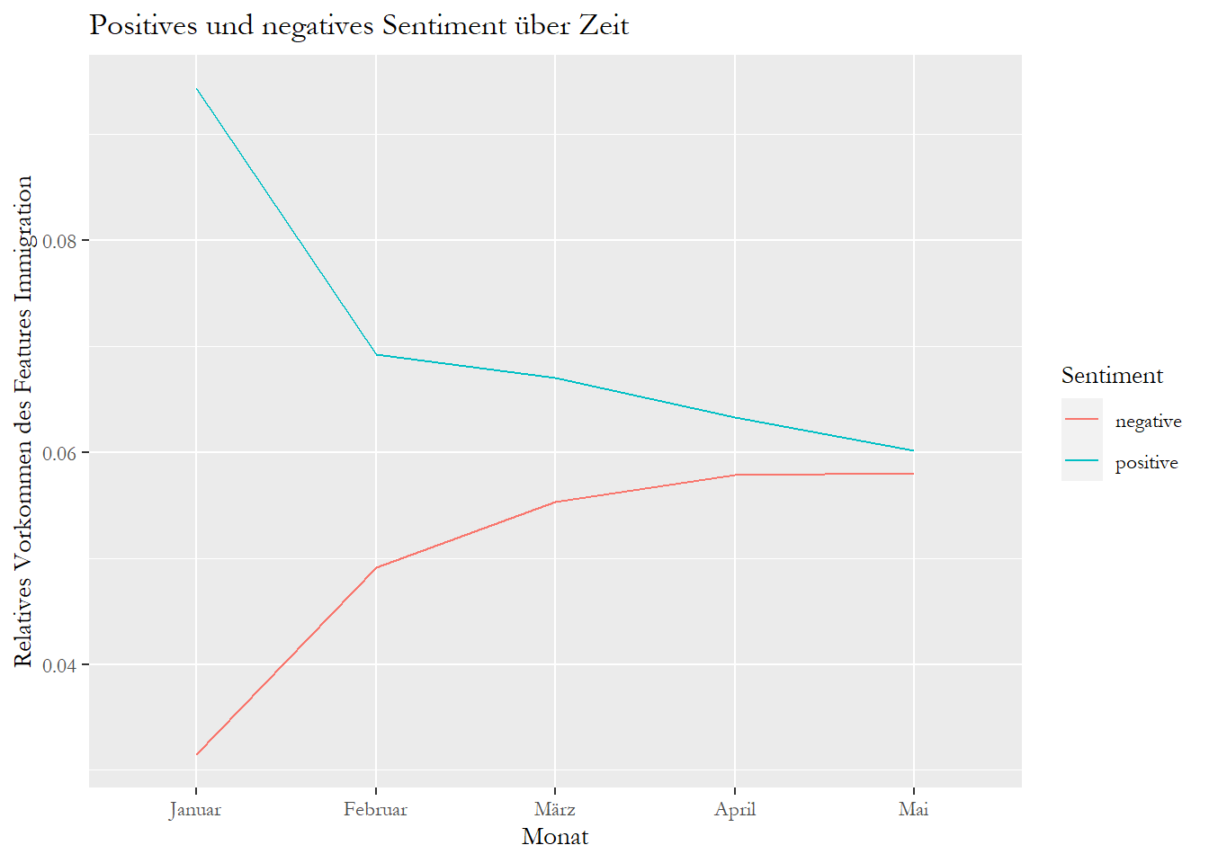 Wir müssen hier wieder vorsichtig sein - denn unser Korpus aus dem Monat Januar enthält nur einen Artikel. Insgesamt scheint es aber so, dass negatives Sentiment über Zeit leicht zugenommen und positives Sentiment leicht abgenommen hat.