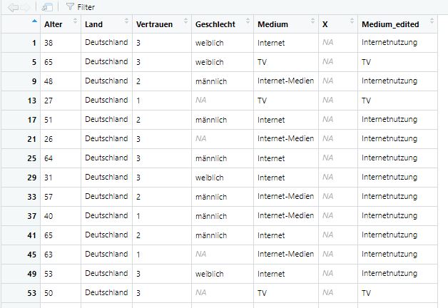 Unser Ziel: Wir wollen eine neue Variable Medium_edited im Datensatz data erstellen, in der diese Ausprägungen “Internet” und “Internet-Medien” zusammengefasst werden.