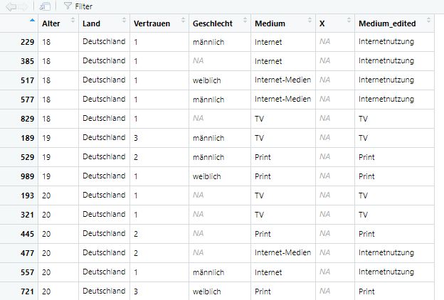 - Dann filtern Sie den Datensatz nach den Fällen, in denen die Variable Medium die Werte “Internet” oder “Internet-Medien” annimmt.