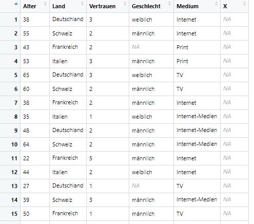 In unserem Fall kann es sein, dass wir nur die ersten 5 Variablen (Alter, Land, Vertrauen, Geschlecht und Medium) behalten wollen, da die sechste Spalte Variable X ja fälschlicherweise eingelesen wurde. Es gibt mehrere Variante, wie wir nur bestimmte Variablen behalten bzw. spezifische Variablen ausschliessen: