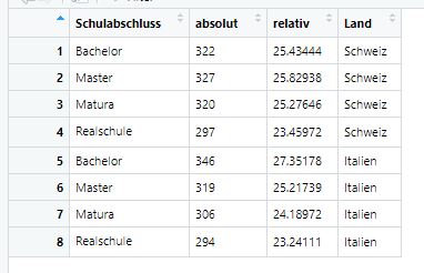- die absolute Anzahl an Schulabschlüssen (getrennt ausgewiesen für Schweizer und Italiener Befragte)
