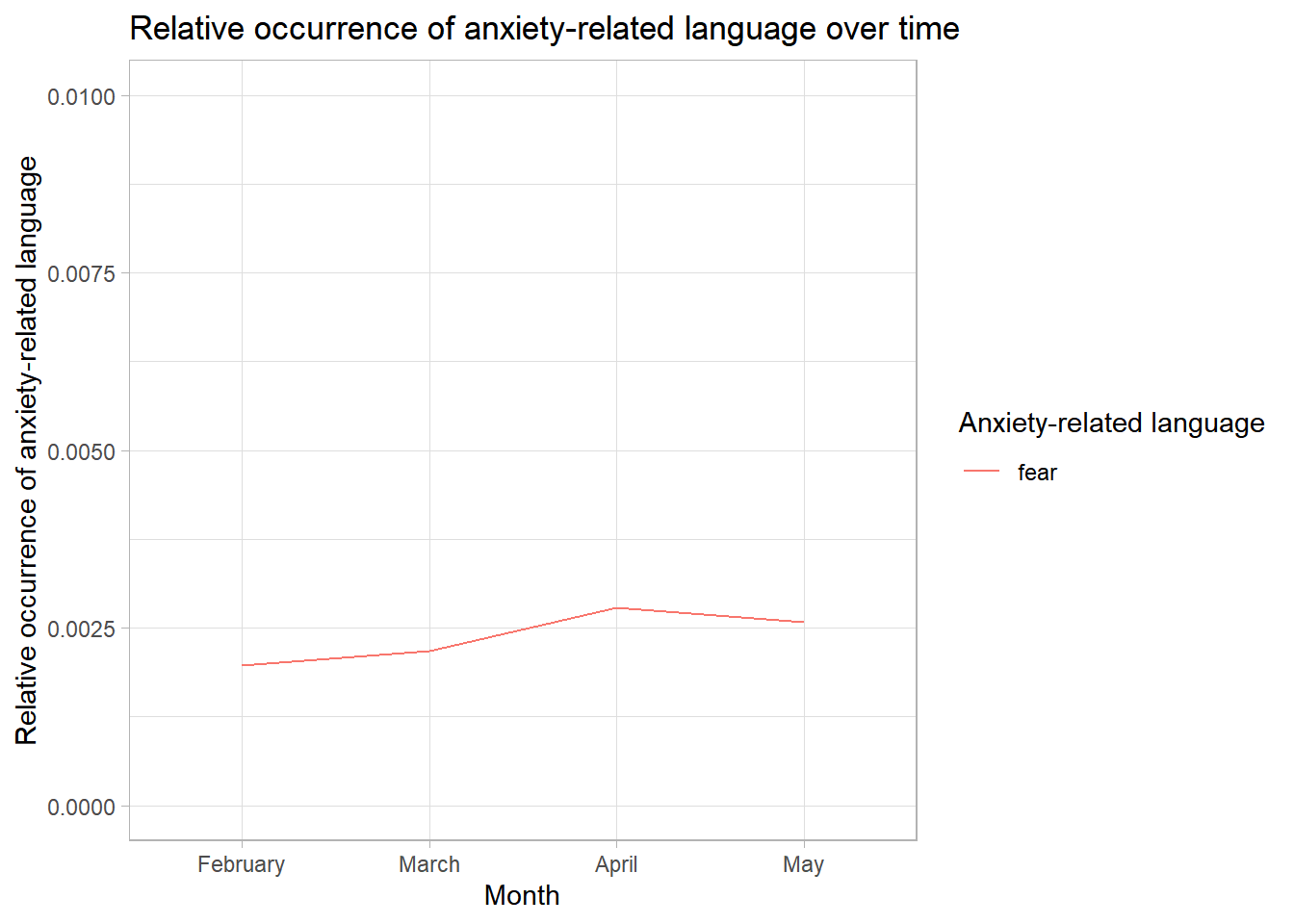 We find a very small increase in anxiety-related language. However, please note: Such features are almost never mentioned (see the small maximum value of the y axis).