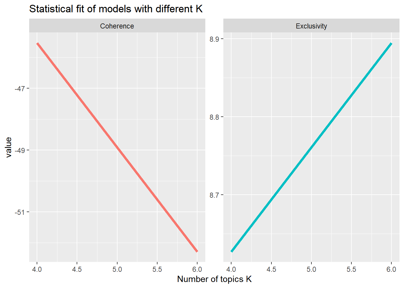 You could therefore consider the “new topic” in the model with K = 6 (here topic 1, 4, and 6): Are they relevant and meaningful enough for you to prefer the model with K = 6 over the model with K = 4?