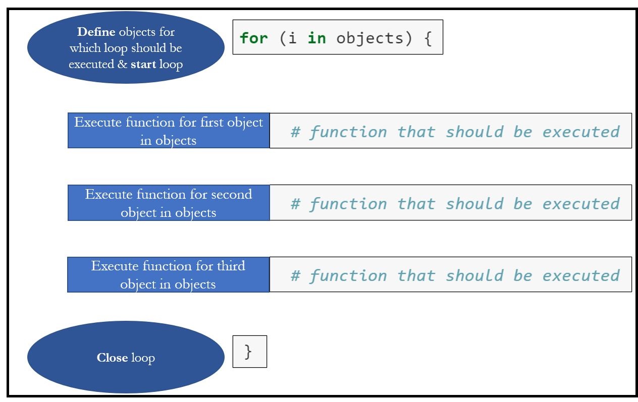 - The first row describes for which object i in a sequence of objects objects a command should be executed. The loop takes every unique object i out of objects.