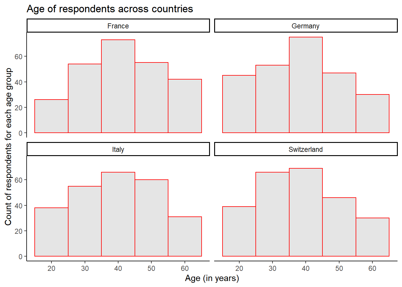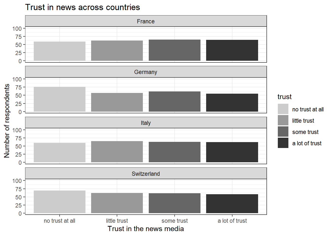 - Lastly, we add the facet_wrap() command and tell R to display the count of respondents for each unique value of trust across countries, with every country being depicted in a single row by setting nrow to 4: