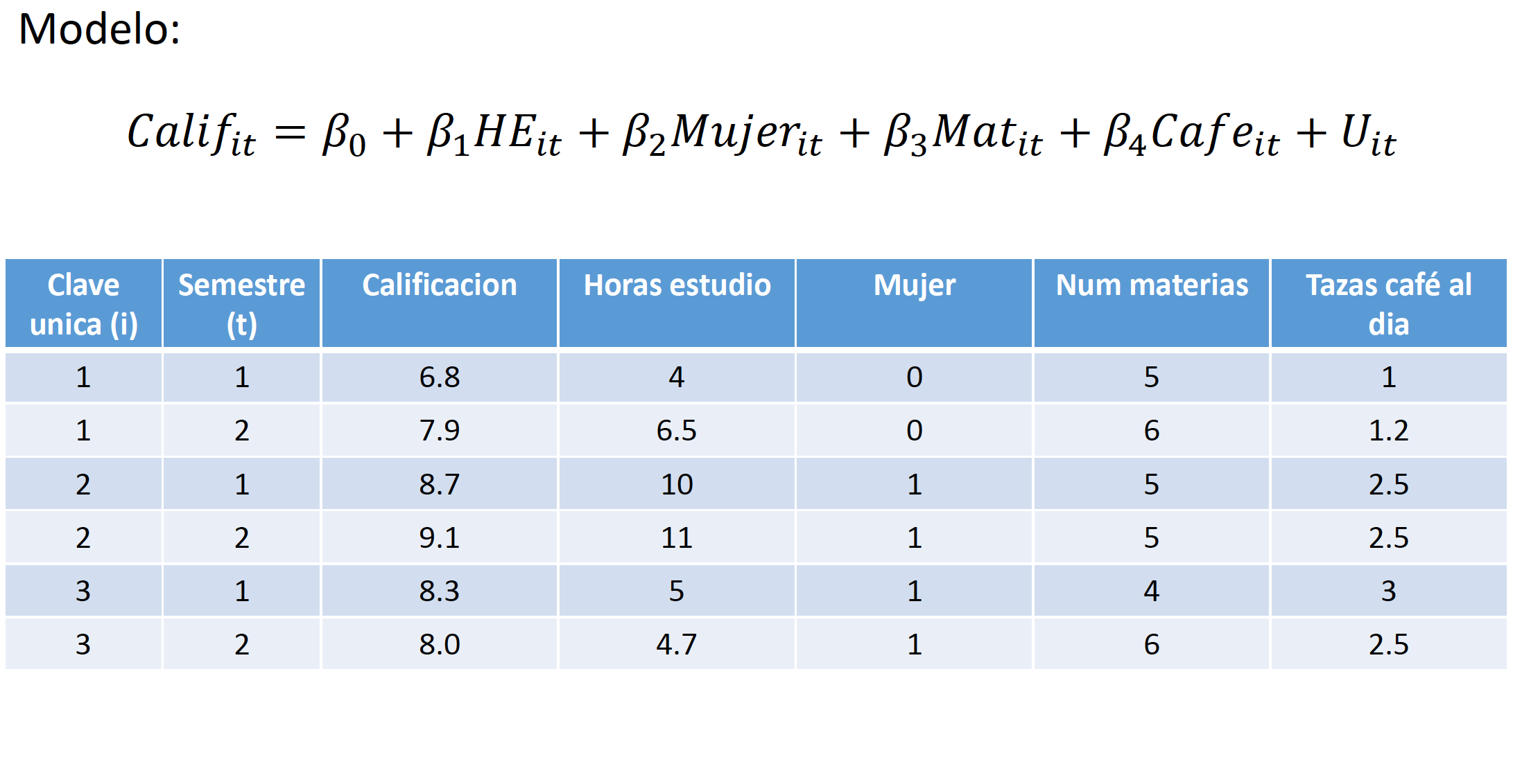 Sin embargo, cabe resaltar que en la especificación del modelo no es estrictamente necesario que \(t\) represente tiempo. Por ejemplo, \(i\) podría representar familias y \(t\) podría representar hermanos; \(i\) podría representar municipios y \(t\) ciudades; \(i\) podría representar partidos políticos y \(t\) candidatos.