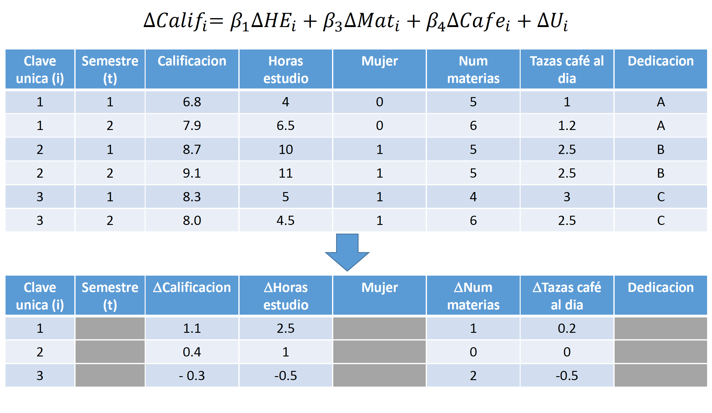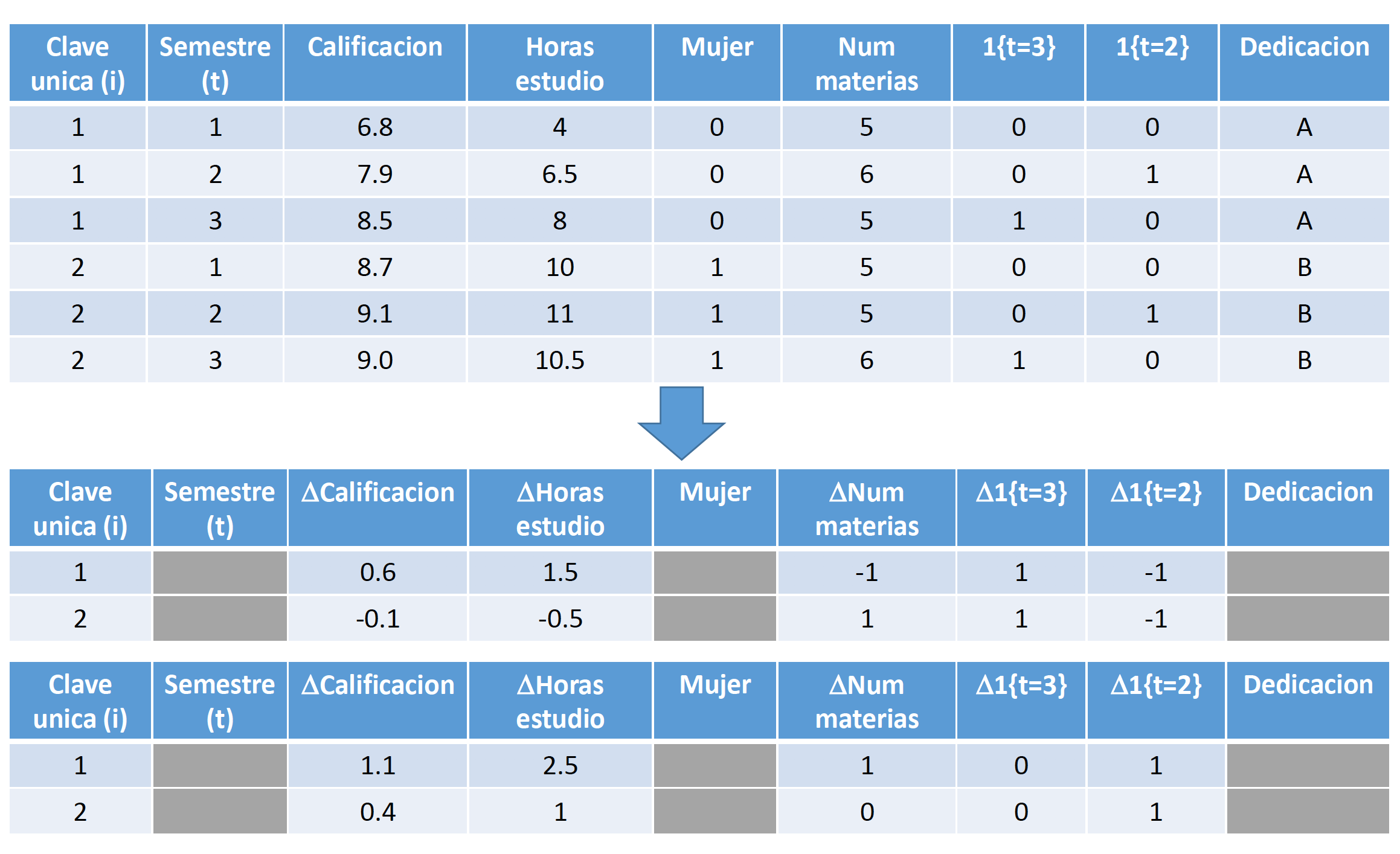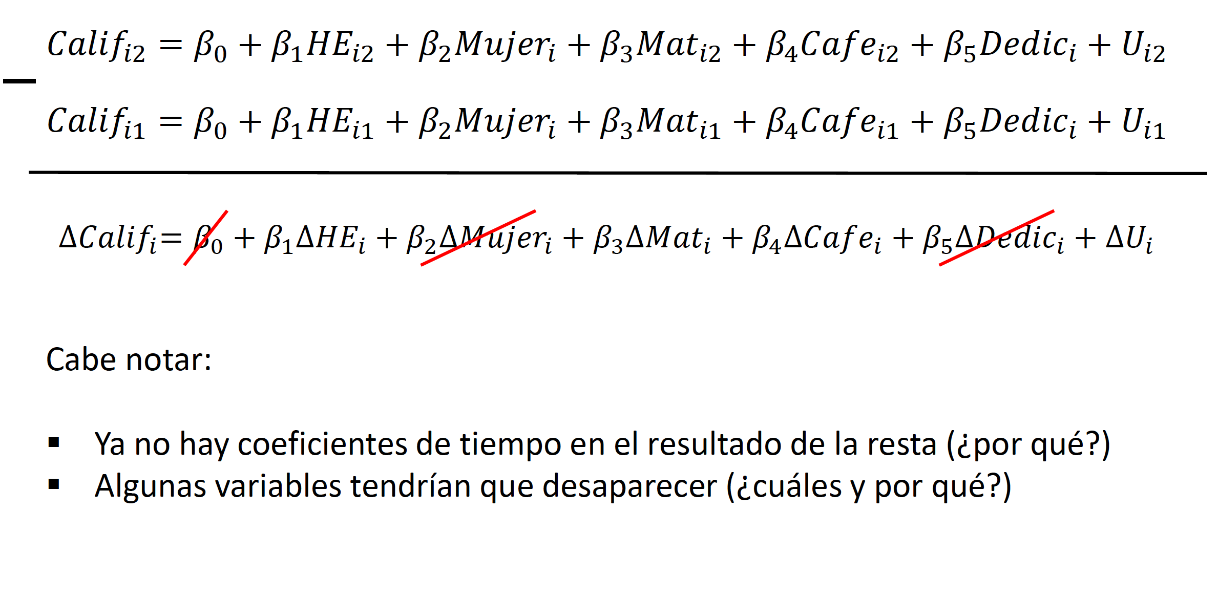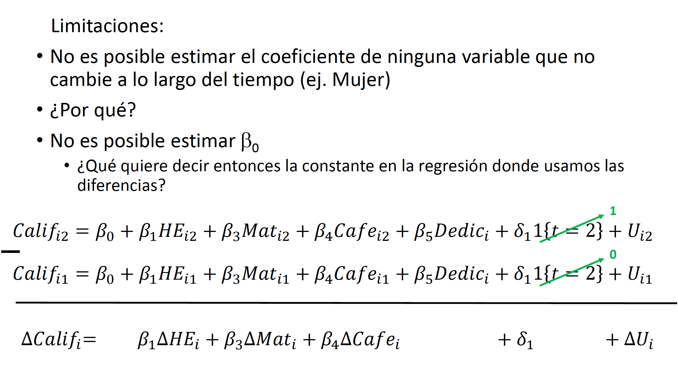 Por último, cabe señalar que estos modelos no permitirán estimar el efecto de variables que no cambian a lo largo del tiempo, como género, raza, etc. Esto sucede ya que estas variables serán eliminadas también siguiendo el procedimiento que utilizamos para eliminar a \(A_i\). Por lo tanto, la diferencia de estas variables será multicolinear con la diferencia de la variable \(A_i\) y la constante.