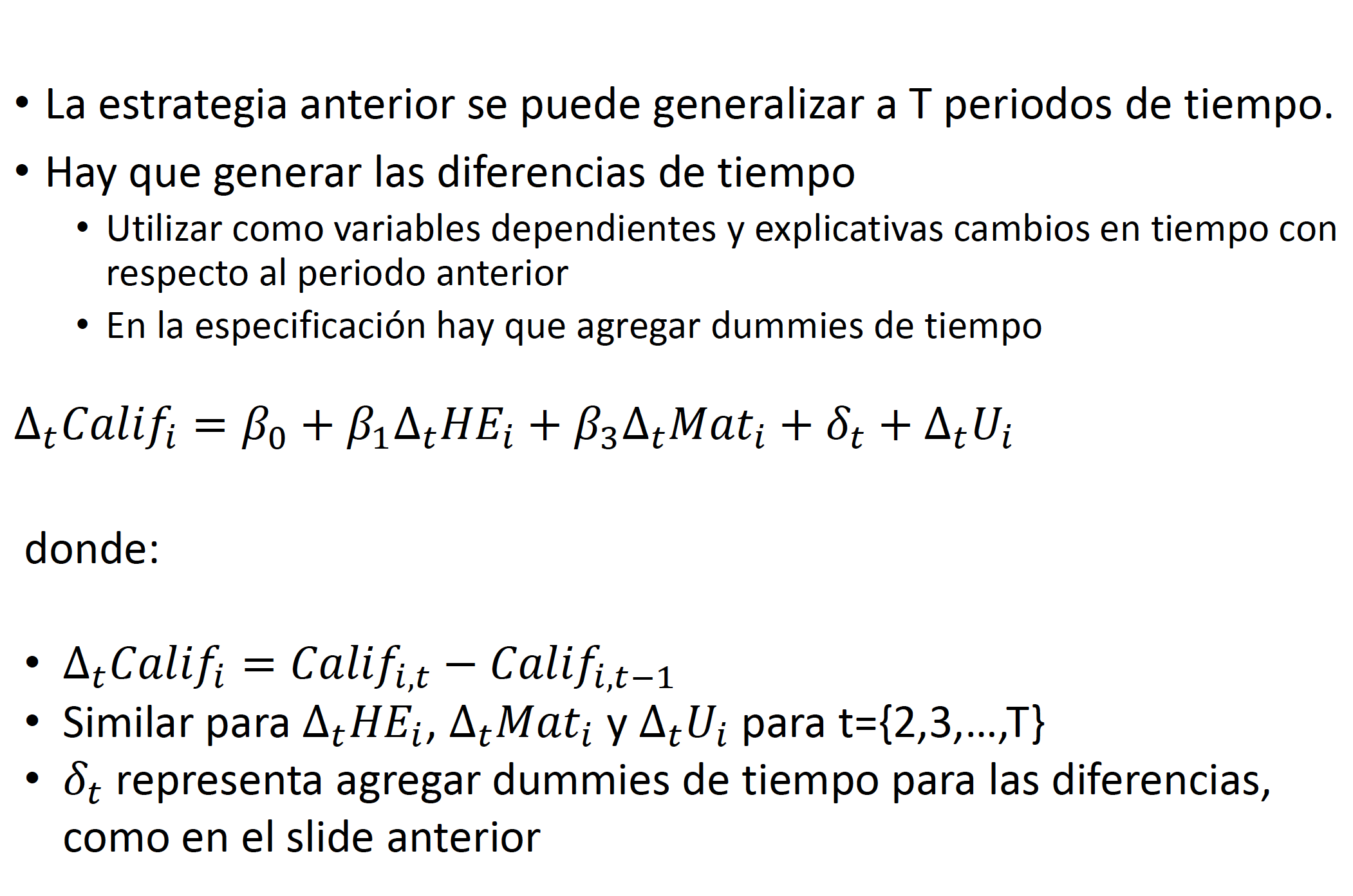 El modelo de primeras diferencias tambien puede estimarse si se tiene más de dos observaciones para cada \(i\) a través del tiempo. Generalmente, si se tienen \(T\) periodos, el modelo sería: \[\begin{equation*} \begin{split} Y_{it}-Y_{it-1}= \delta_t-\delta_{t-1}+\beta_1(X_{1it}-X_{1it-1})+\dots+\beta_K(X_{Kit}-X_{Kit-1})+(U_{it}-U_{it-1}) \end{split} \end{equation*}\]