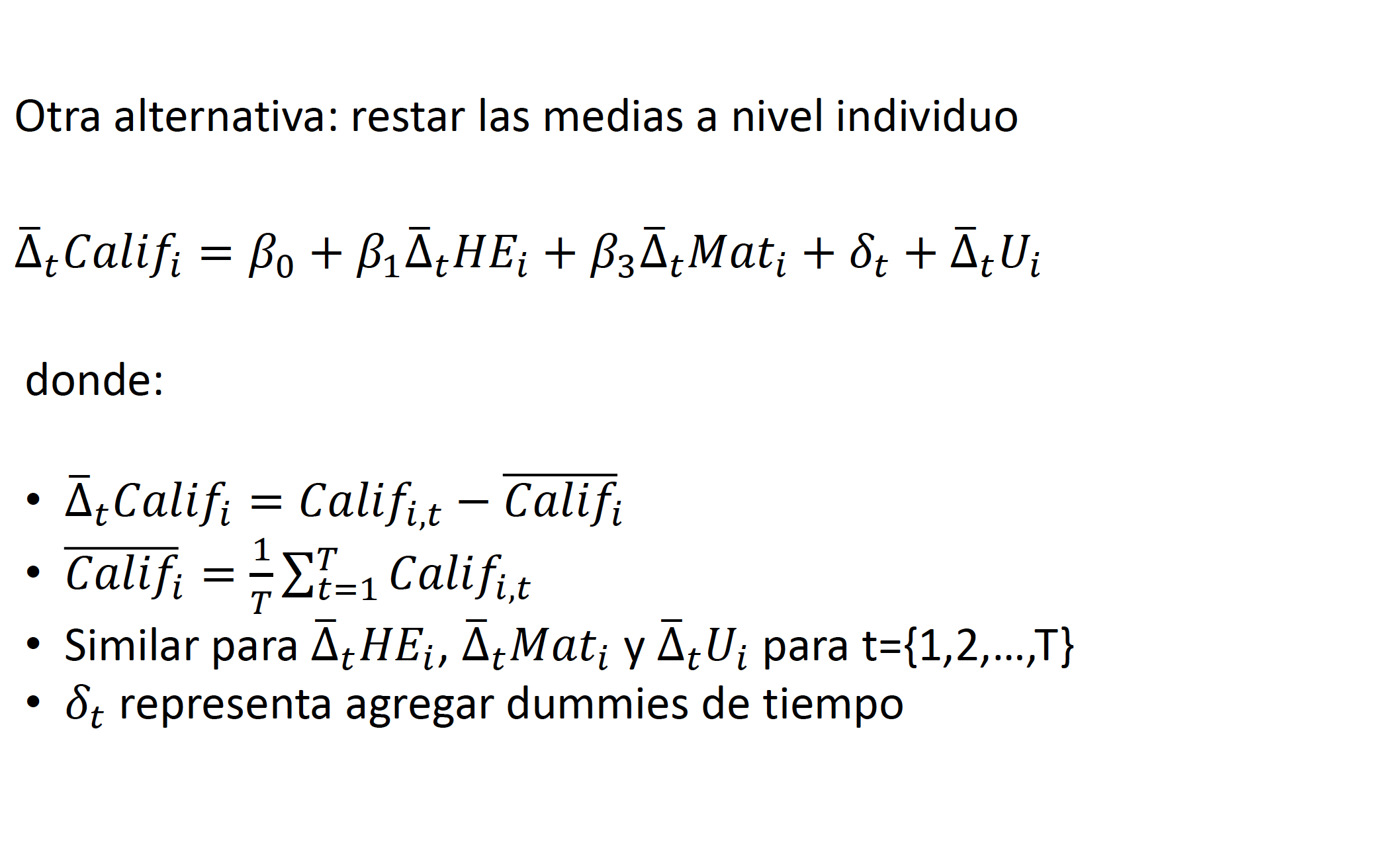 Siguiendo con nuestro ejemplo anterior (y asumiendo una base de datos de panel balanceada) tomemos la ecuación [(4.1)] y calculemos el promedio para cada individuo asumiendo en este caso que existen \(T\) periodos de tiempo: