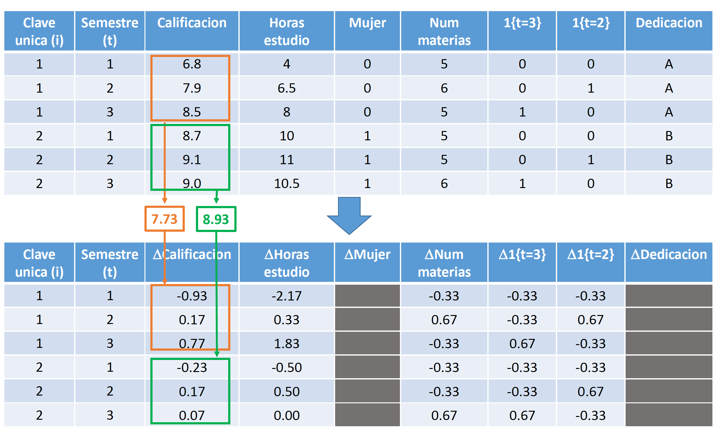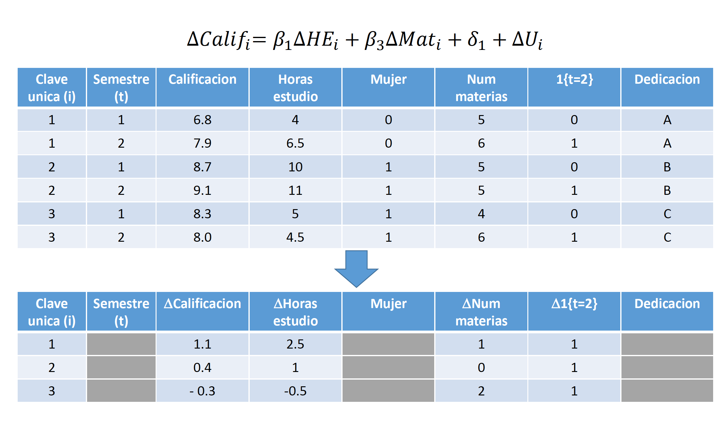 donde \(A_i\) representa la habilidad del individuo \(i\). Nótese que esta variable no tiene un subíndice \(t\), ya que la habilidad de cada individuo no varía a través del tiempo, pero si varía de un individuo a otro. En nuestro caso, solo tenemos dos momentos en el tiempo (\(t=1,2\)), por lo tanto, si tomamos la diferencia de \(t=2\) menos \(t=1\) para cada individuo: