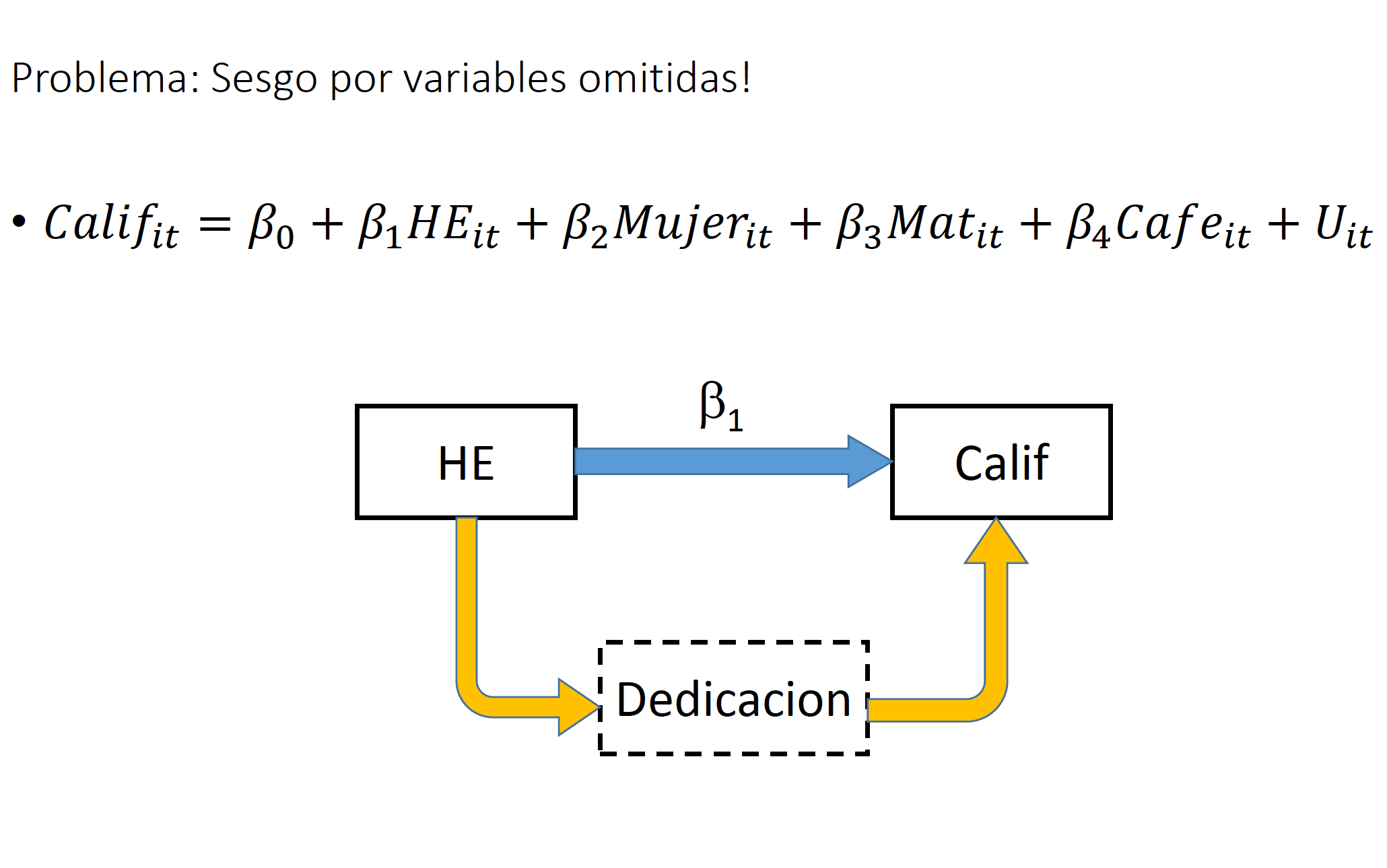 Es importante señalar que cualquier variable omitida que no sea constante a través del tiempo para cada individuo, puede causar sesgo en este modelo. En nuestro ejemplo, una mejora alimenticia es un ejemplo de variable que podría seguir causando sesgo. Asimismo, es importante que exista variación en la variable independiente. En nuestro ejemplo, esto podría causar conflicto, ya que es de esperarse que la muestra este compuesta por individuos adultos perceptores de ingresos. En este grupo, sería de esperarse que la variable educación no cambie mucho.