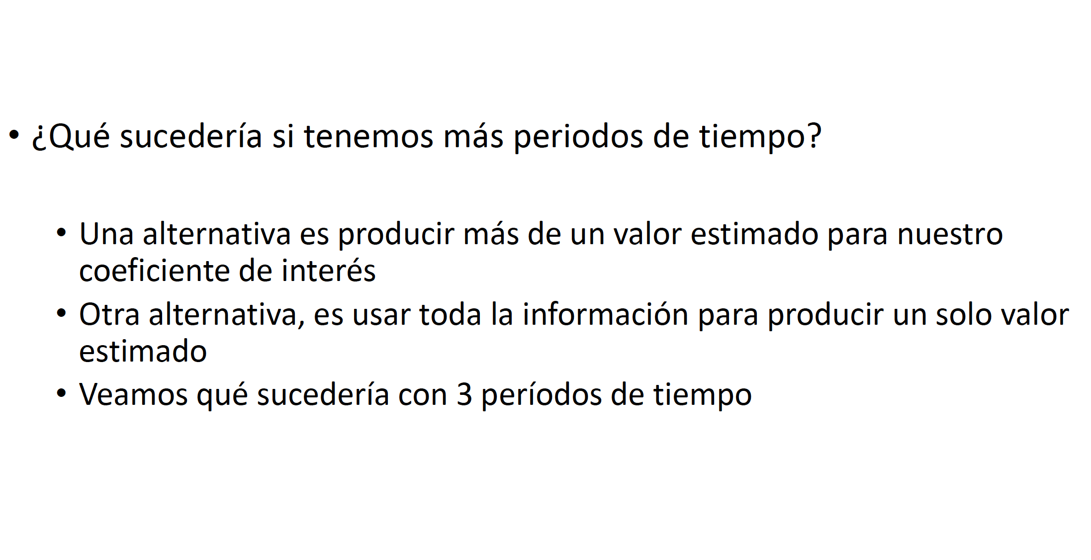 En este caso, cada unidad \(i\) tendría \(T-1\) observaciones. El procedimiento consistiría en estimar la regresión utilizando MCO. Si la base de datos de panel es balanceada, se tendrían \(N*(T-1)\) observaciones.