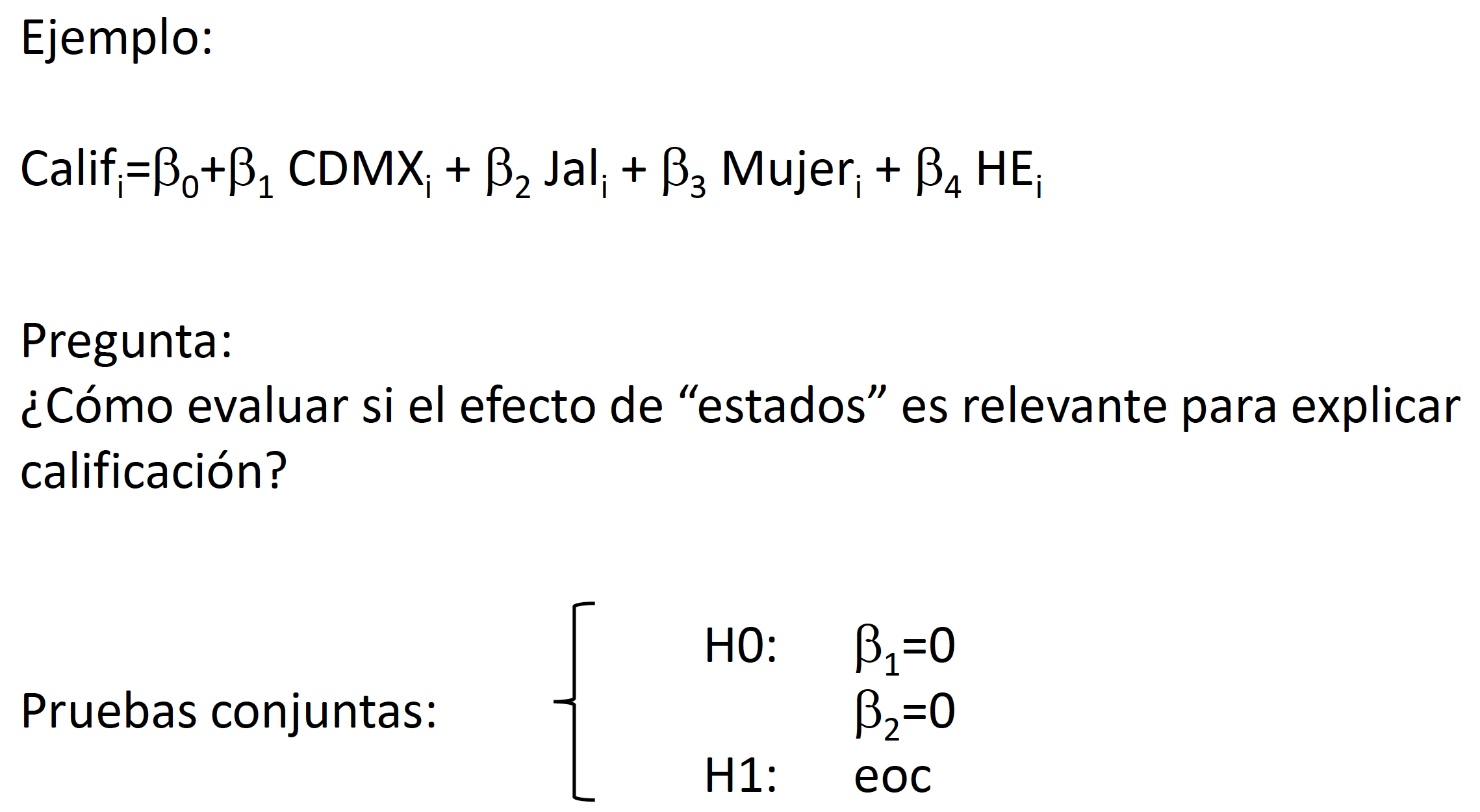 Al igual que en el caso anterior, la motivación a la prueba de hipótesis que se quiere evaluar debe venir de la interpretación de los coeficientes y veremos ejemplos relacionados. La igualdad del lado derecho nuevamente no necesariamente debe ser un vector \(h\) de ceros. Asimismo, la matriz \(L\) puede ser mas complicado, lo único necesario es que cada renglón (o condición) a evaluar debe ser una combinación lineal de coeficientes, de la misma forma que \(l'\beta\). Por ejemplo, si se quisieran evaluar las siguientes condiciones: \[\begin{equation*} \begin{split} H_0: & \quad 2~\beta_1+\beta_2=0 \\ & \quad \frac{1}{3}~\beta_1-3~\beta_3=0 \\ & \quad \beta_1+\beta_2+\beta_3+\beta_4=0 \\ H_1: & \quad e.o.c. \end{split} \end{equation*}\]