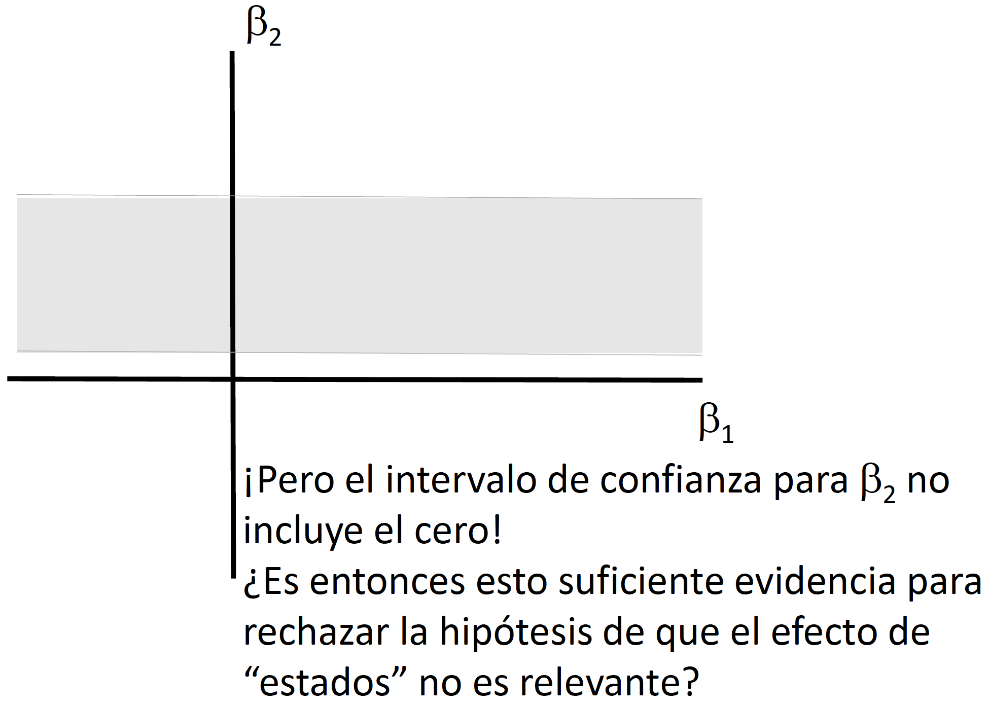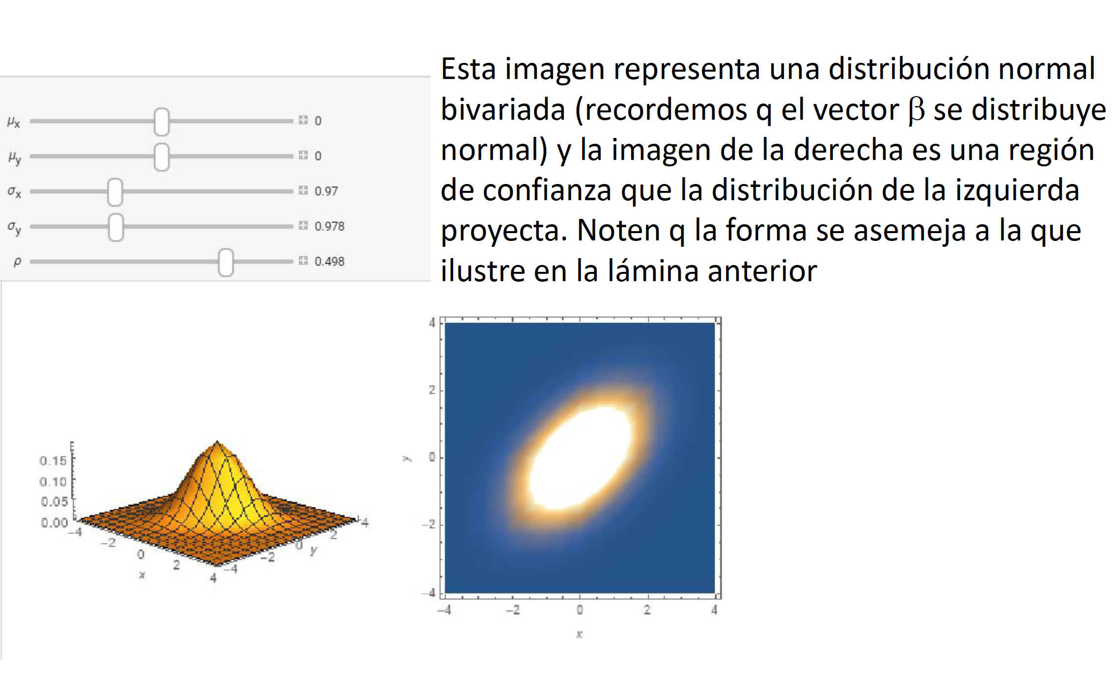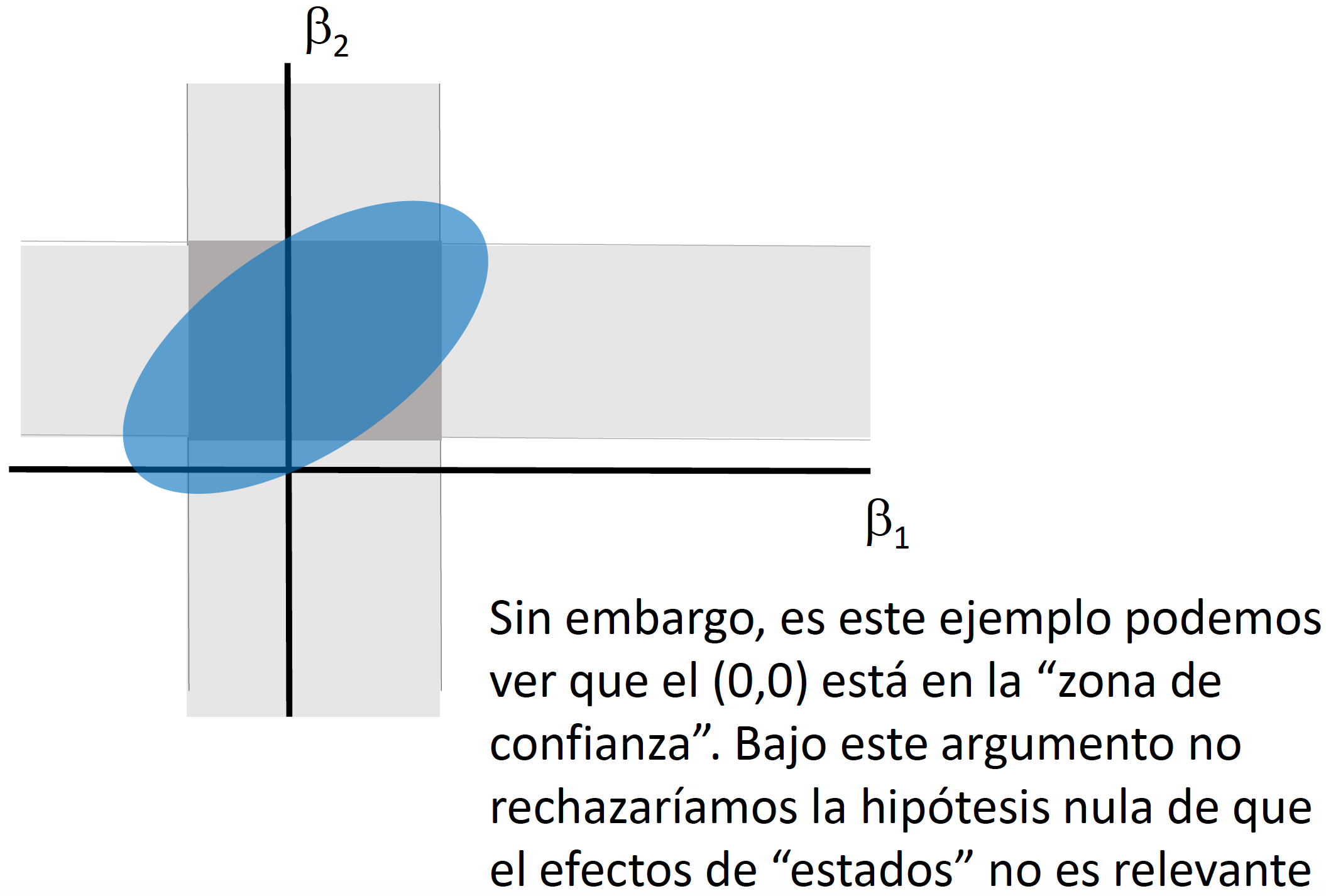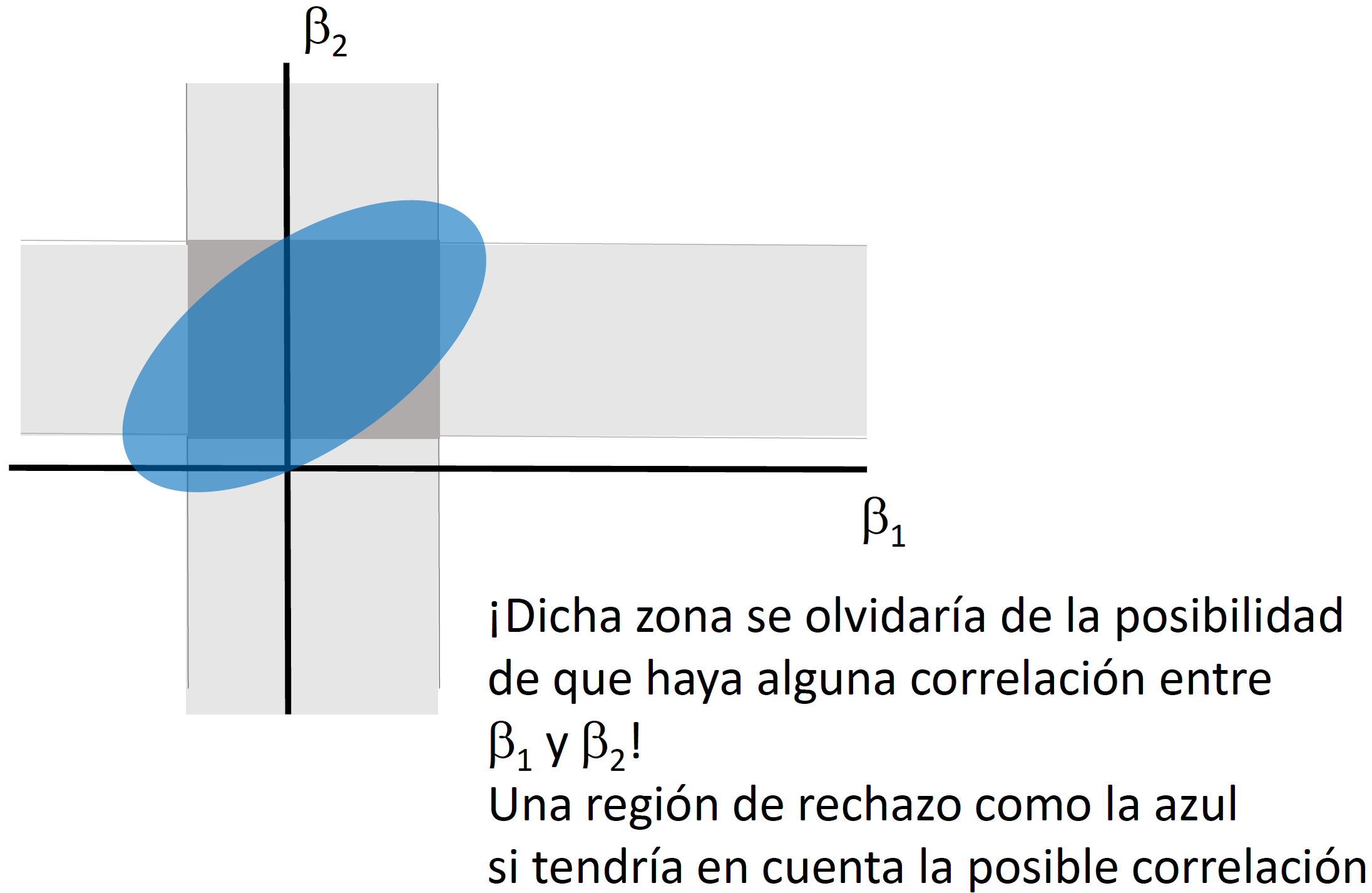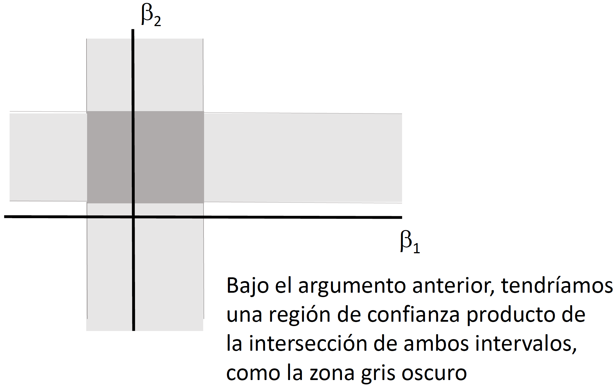 Si quisiéramos llevar a cabo pruebas de hipotesis multi-dimensionales, en vez de un intervalo de confianza necesitaríamos generar una elipse de confianza (o una región de confianza). Llevar a cabo pruebas de hipótesis de forma independiente (como lo veremos en clase) implica dejar de considerar la covarianza que puede existir entre los coeficientes.