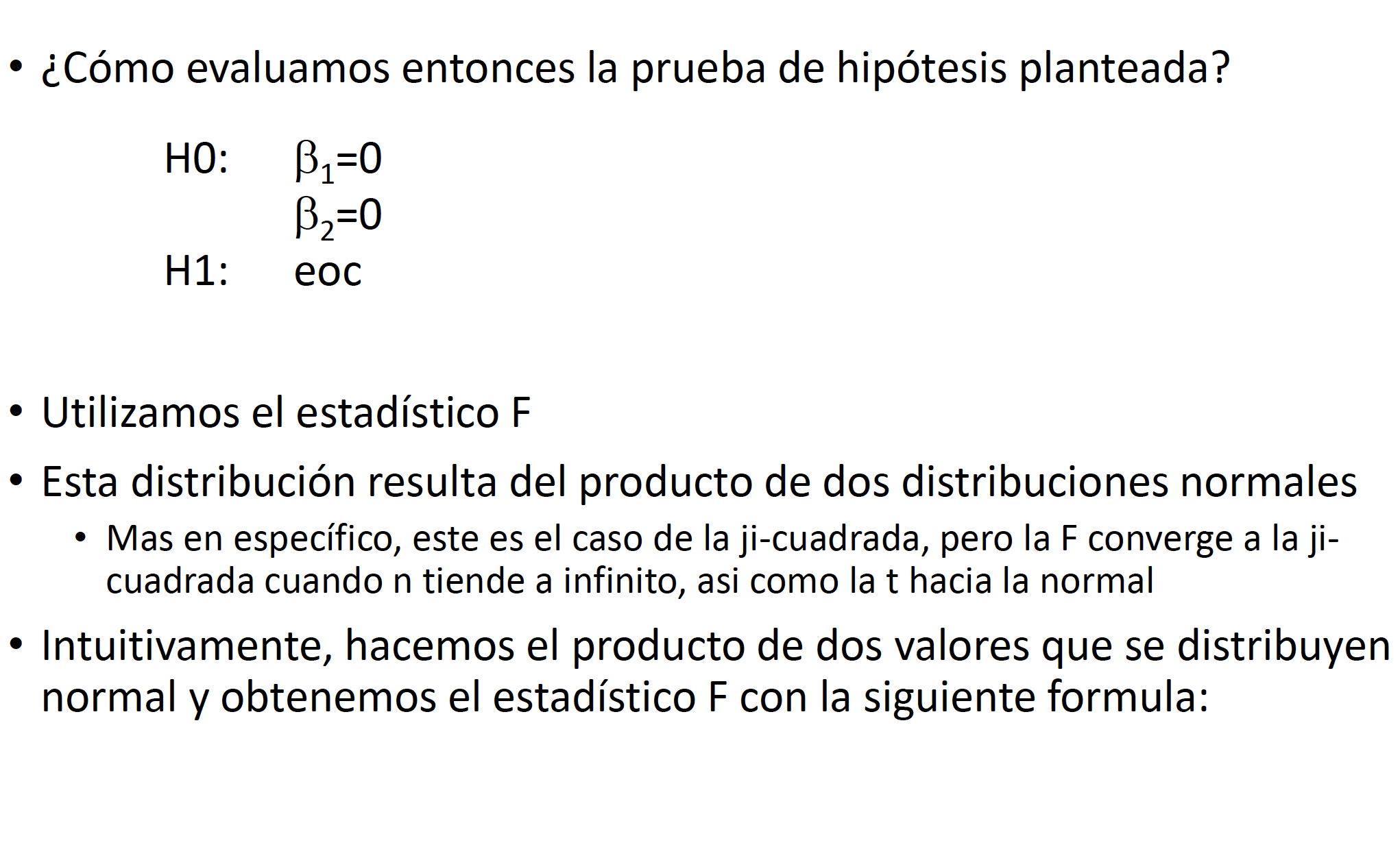 \[\begin{equation*} \begin{split} H_0: & \quad l'\beta=0 \\ H_1: & \quad l'\beta \neq 0 \end{split} \end{equation*}\] Nótese que en vez del valor “\(0\)” se puede usar cualquier constante. Este planteamiento permite hacer pruebas de hipótesis para coeficientes de forma individual. Esto es lo más común en la práctica, donde evaluamos la representatividad de un coeficiente individual. También pueden evaluarse combinaciones lineales de coefientes, como por ejemplo \(\beta_1+\beta_2\), además de combinaciones lineales más complejas. La motivación para hacer pruebas de hipótesis con combinaciones lineales la analizaremos más a profundidad en la siguiente sección ya que la combinación adecuada a evaluar generalmente viene motivada por la interpretación de los coeficientes. En ese momento discutiremos algunos ejemplos. Por lo pronto basta entender que el planteamiento de \(l'\beta\) permite hacer estimaciones de combinaciones tan complejas como: \(\beta_1+\frac{1}{2}~\beta_2-4~\beta_4\). En este caso, si estamos estimando una especificación con \(4\) variables (más la constante), \(l'=[0~~1~~\frac{1}{2}~~0~~4]\).