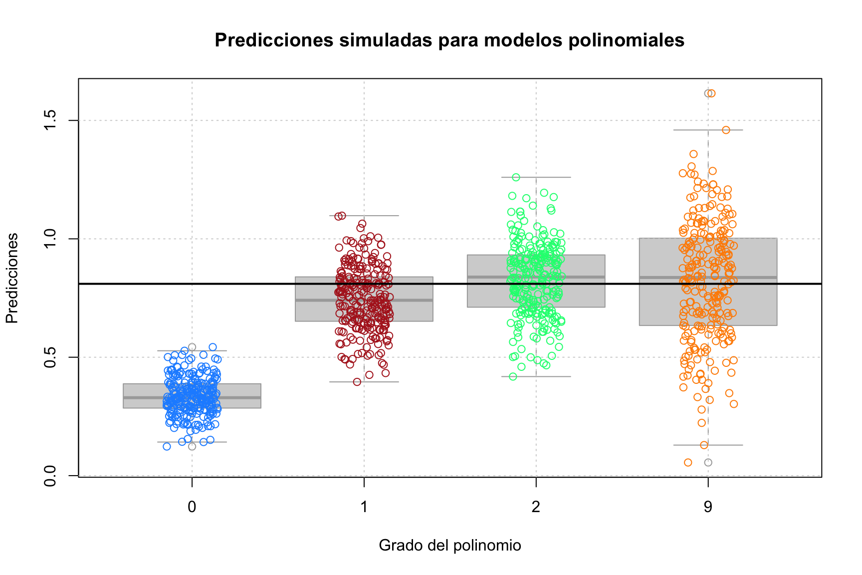 c("y ~ 1", "y ~ poly(x, 1)", "y ~ poly(x, 2)", "y ~ poly(x, 9)", "verdadero"),