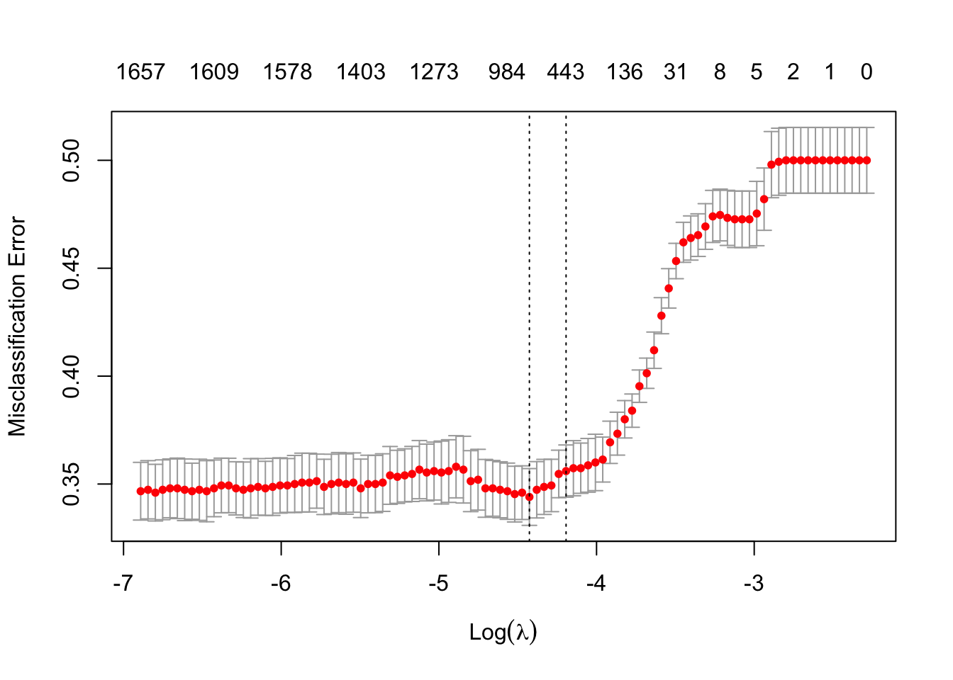 cv <- cv.glmnet(train.matrix,y=as.factor(train.headlines$y), alpha=1,family='binomial', nfolds=10, intercept=F,type.measure = 'class')