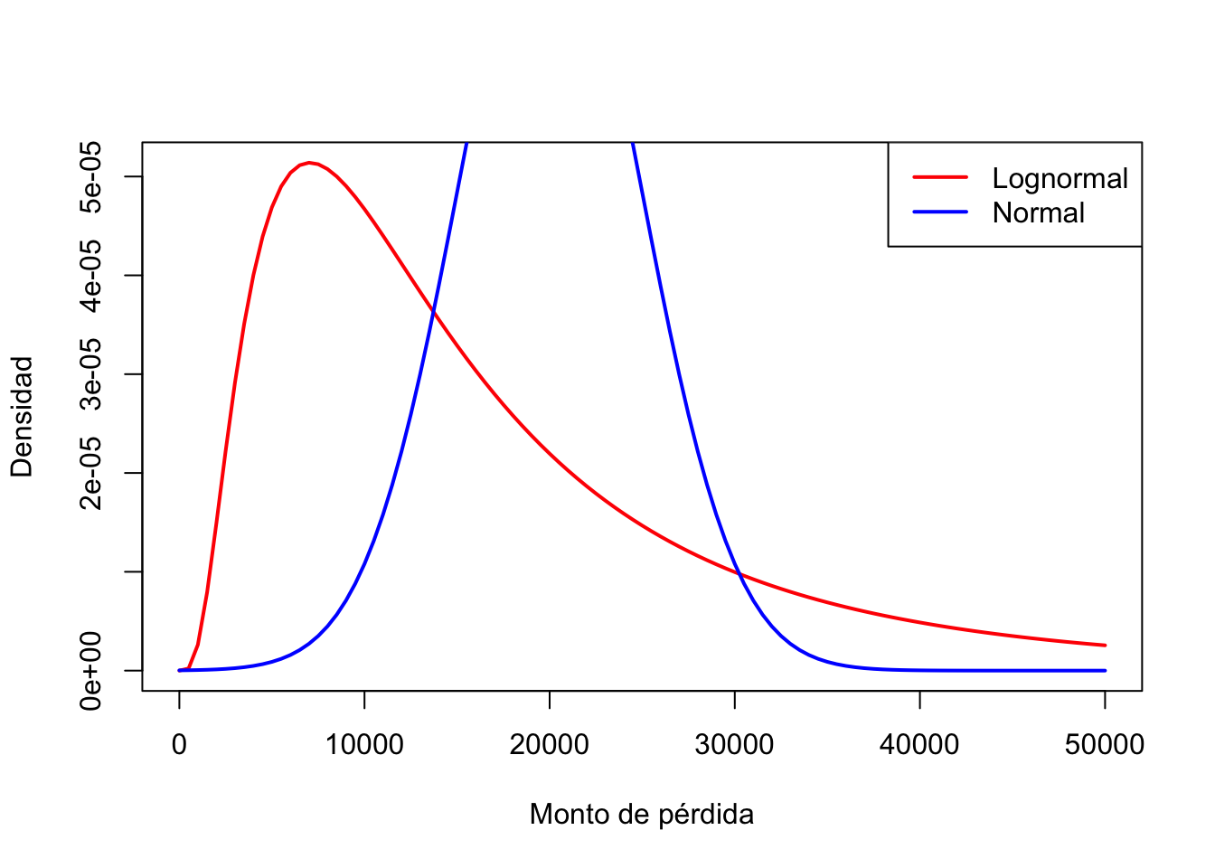 Se asume que las pérdidas siguen una distribución lognormal con media logarítmica 9.5 y desviación estándar logarítmica 0.8.