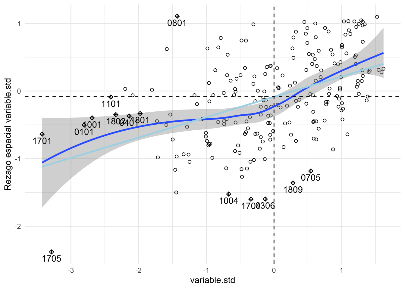 cont.listw <- nb2listw(cont.nb, style="W",zero.policy = TRUE)Vemos el gráfico que también se muestra en 7.2.4 pero se le ha agregado un suavizamiento LOESS (suavizado de ponderación local) y una tendencia lineal.