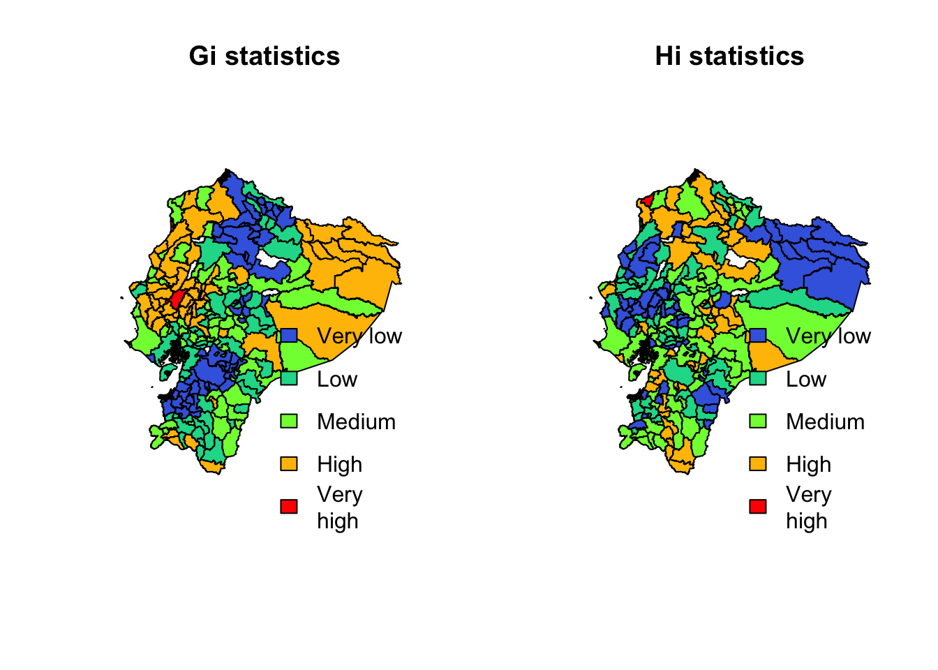 | Local \(H_i\), LOSH | Local | Medida de relaciones espaciales | Interpretado junto con las estadísticas \(G^*\). Valores altos indican un entorno heterogéneo; valores bajos indican homogeneidad local. | LOSH() |