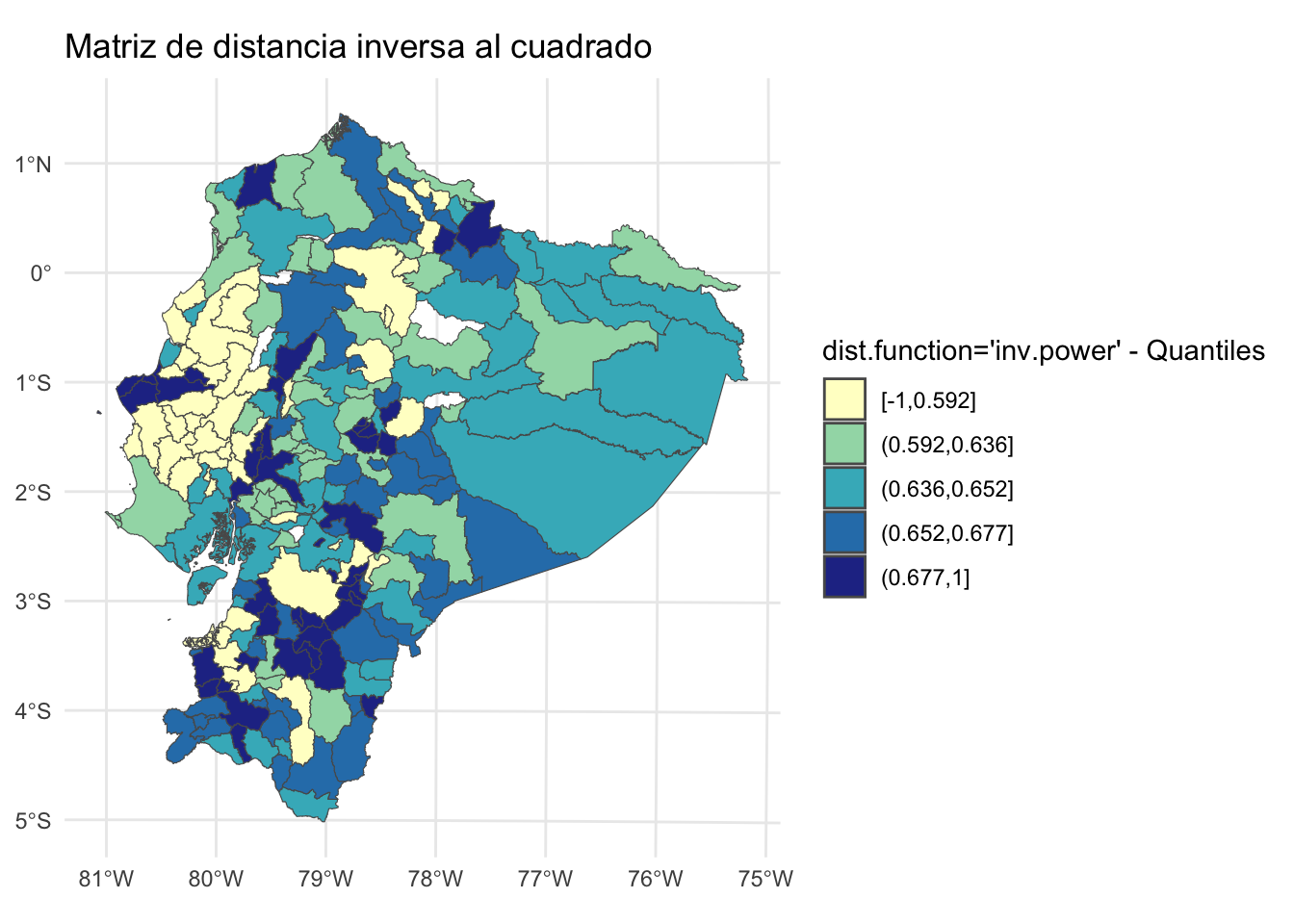 # title = "Matriz de distancia inversa al cuadrado: dist.function='inv.power'") +