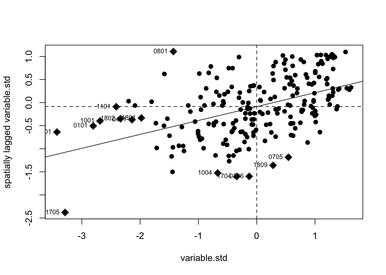 ## Moran I statistic standard deviate = 7.0419, p-value = 9.483e-13
