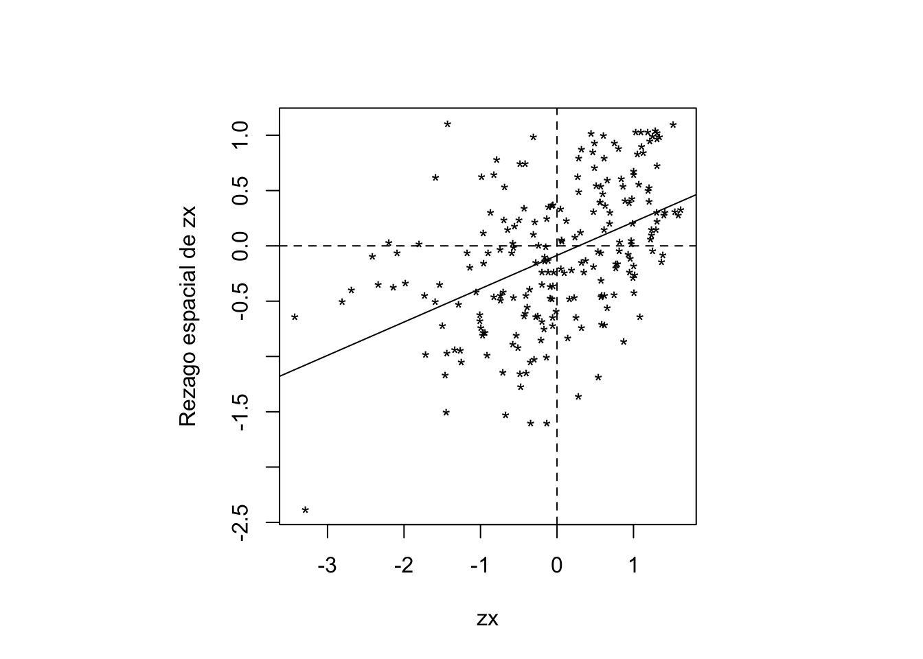 \[ R_i^{(xy)} = x_i\sum_jw_{ij}y_j \] \[ R_j^{(yx)} = y_i\sum_jw_{ij}x_j \] donde \(i\) y \(j\) son diferentes unidades espaciales y \(w_{ij}\) son elementos de la matriz de pesos espaciales \(W\).