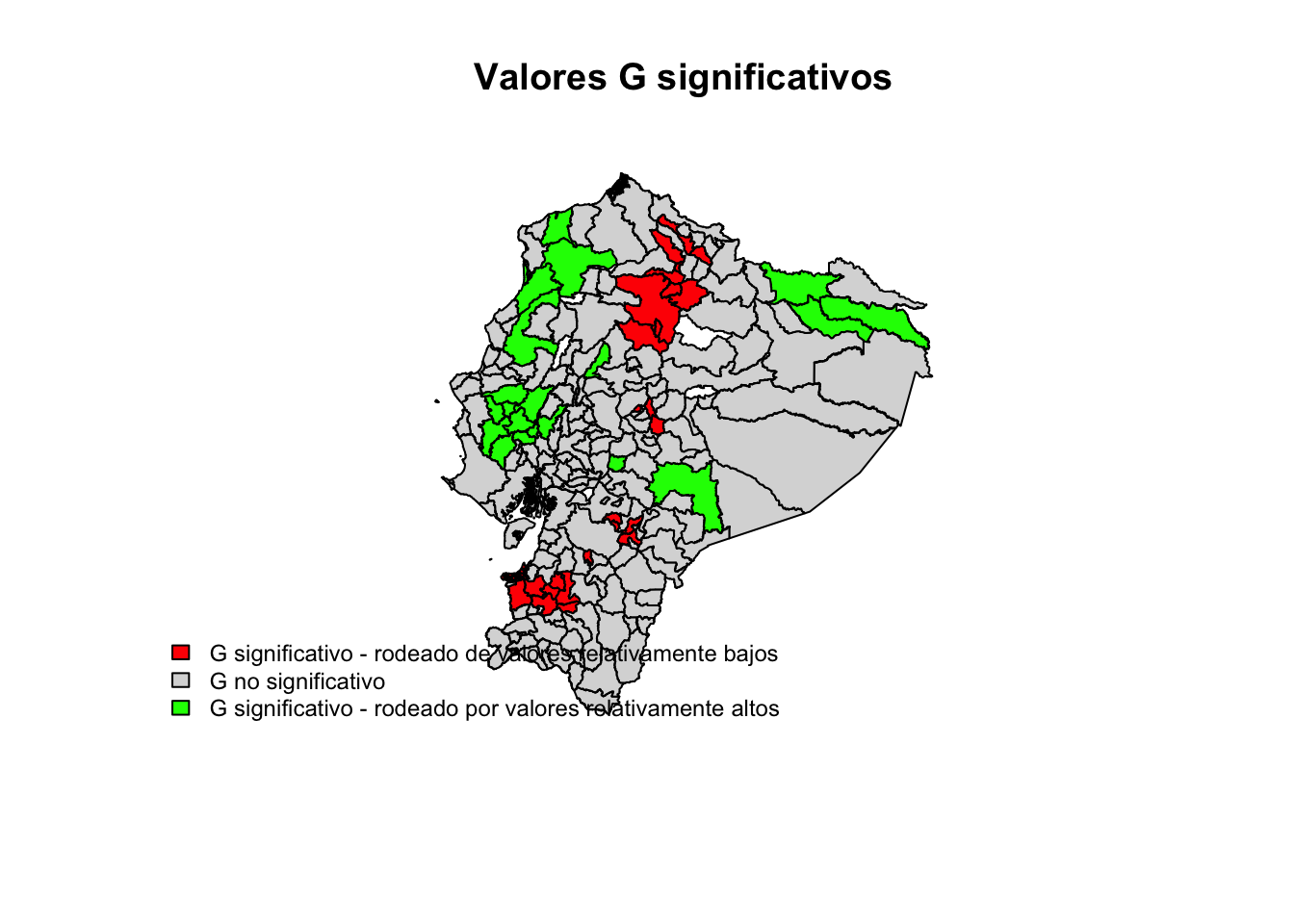 | Local \(G_i\), \(G^*\) | Local | Medida de relaciones espaciales | \(G_i> 0\): área rodeada por valores relativamente altos, clúster de alto valor \(G_i <0\): área rodeada por valores relativamente bajos, clúster de valor bajo |