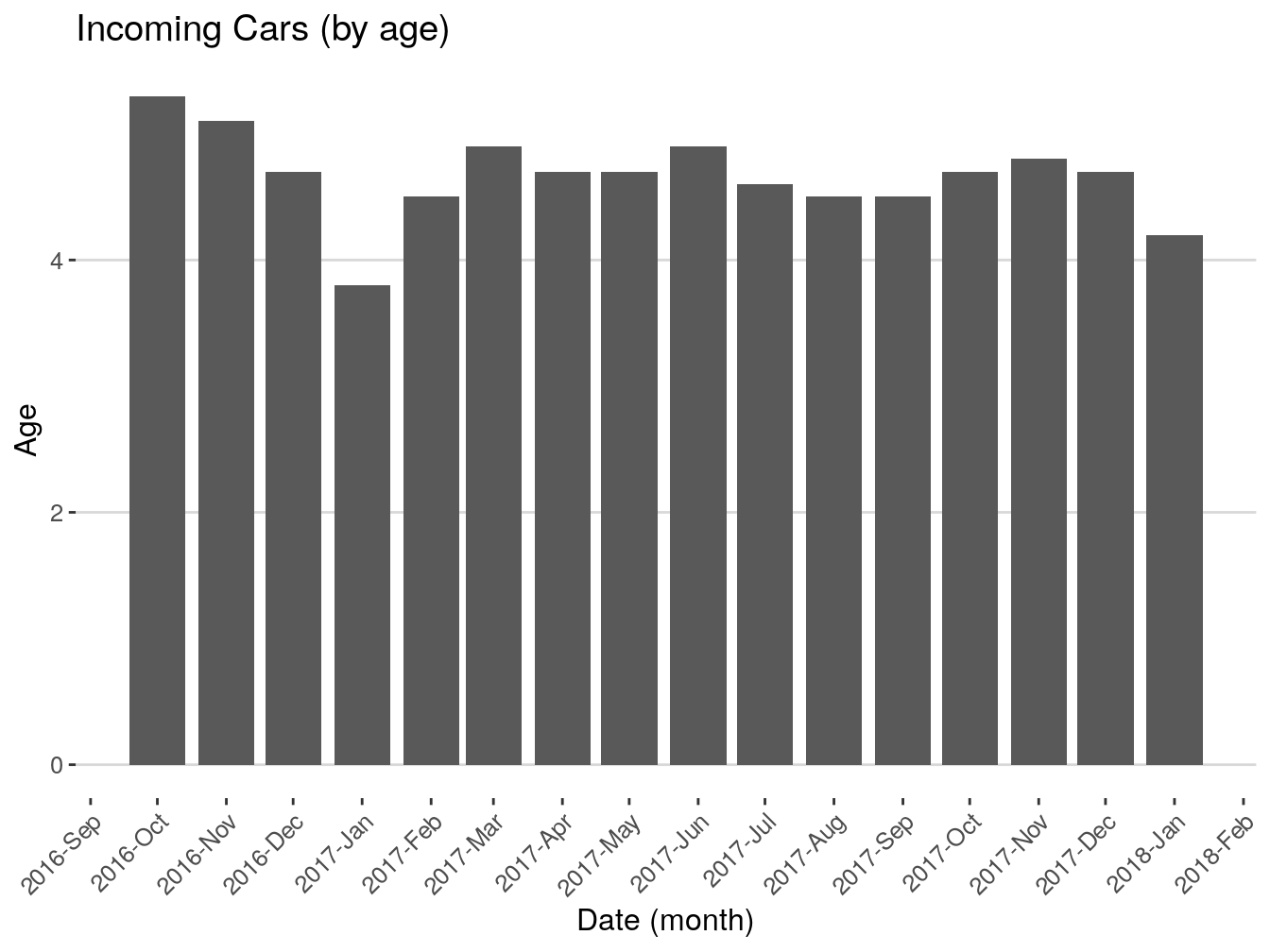 Now, we can find the average age of our vehicles by month.