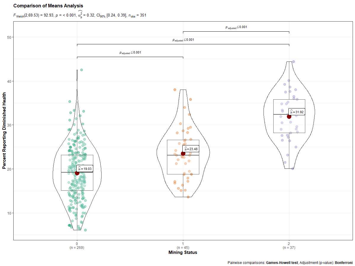 The ggstatsplot package command offers a one-stop shop for ANOVA, producing not only the desired statistics, but a graph as well. Note: If variances are equal, you can include var_equal = TRUE as an additional argument in the command. You can find helpful webpages on ggstatsplot::ggstatsbetween here, here, and here.