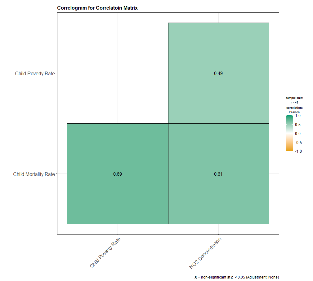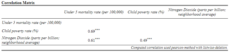 I find sjPlot’s tab_corr function to offer the easiest path to creating a correlation matrix (in pre-formatted table no less!). This command produces a html file that is saved to your working directory. You can copy/paste the table into a Word document. If you want the actual p-values, include ‘p.numeric = TRUE’ as an argument in the command. In the following command, I use tidyverse’s dplyr select function to pull the variables of interest before using sjPlot’s tab_corr function to generate a correlation matrix table.