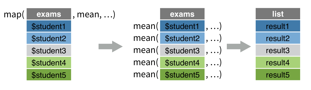 成功了。但发现我们写了好多代码,如果有100个学生,那就得写更多的代码,如果是这样,程序员就不高兴了,这太累了啊。于是purrr包的map函数来解救我们,下面主角出场了。