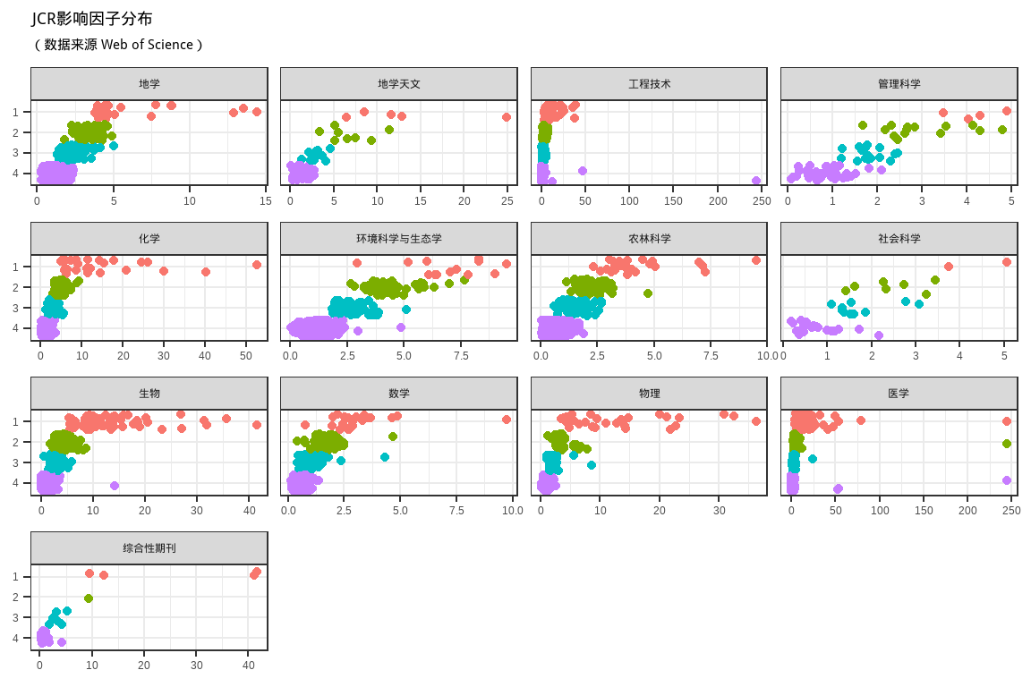 ggtitle("JCR影响因子分布", subtitle = '(数据来源 Web of Science)')