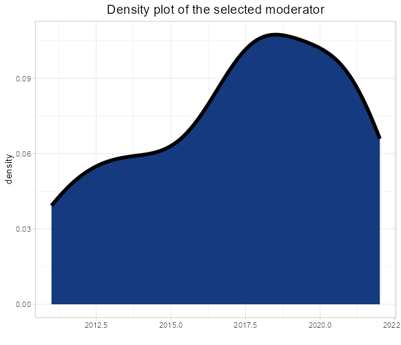 - For a continuous moderator, density and correlation plots are presented. The right plot enables the diagnosis of the correlation statistic and p-value, highlighting any correlation between the effect size and the selected value.
