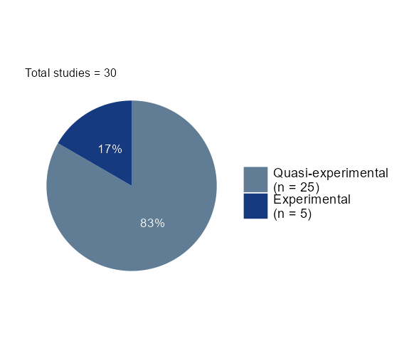 - For a discrete variable, a pie chart illustrating the distribution and an estimate plot will be shown. The right plot displays the average effect size for each category. When the selected moderator is the evaluation design, you must choose a reference category for the regression. By default, the application processes the first category as the reference, but you can manually select a different category.